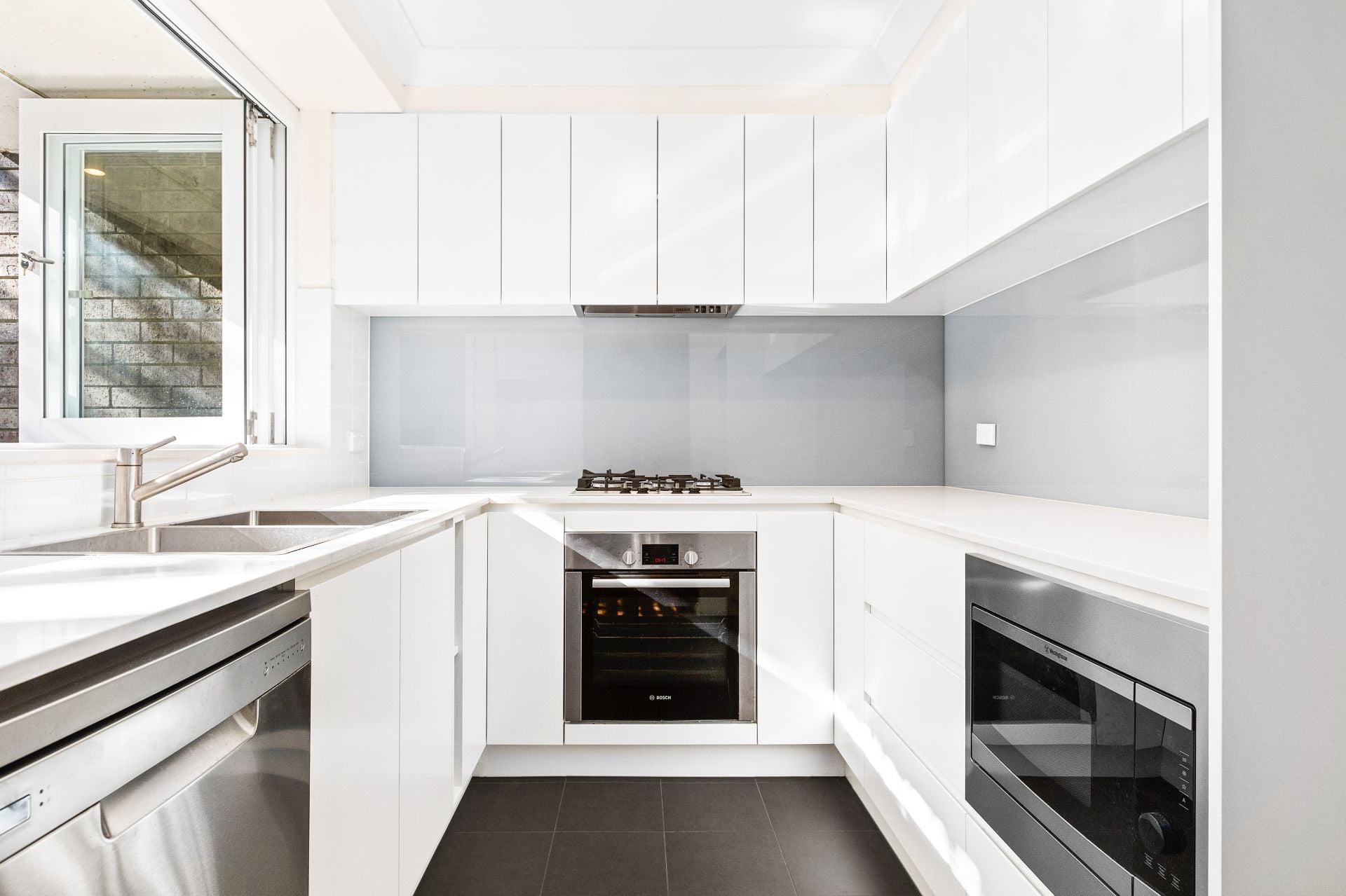 Stylish gas kitchen with ample storage, stainless steel appliances, dishwasher, and servery to courtyard