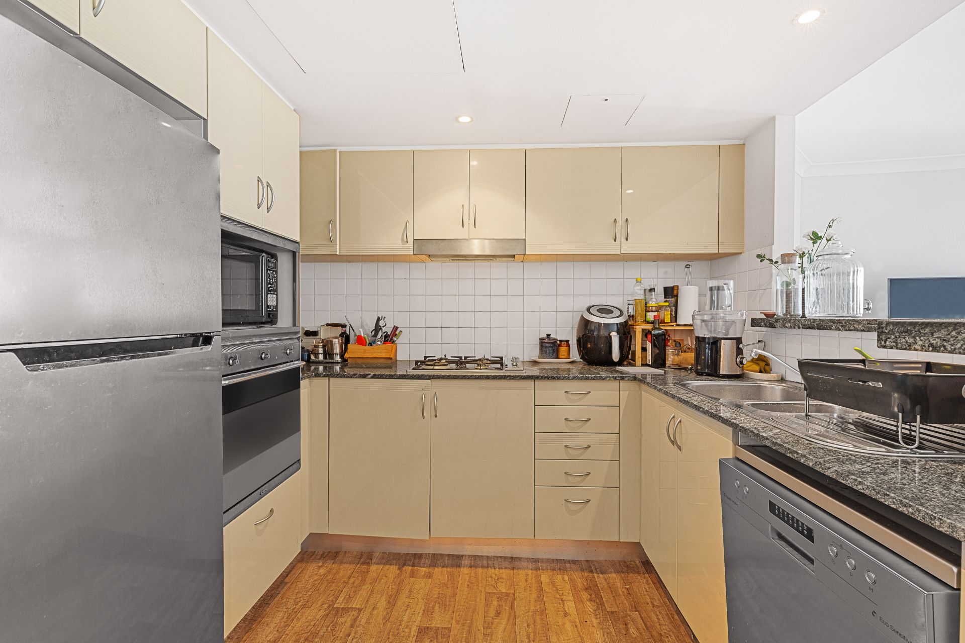 Full size kitchen with granite benchtop, gas cooking and a fitted dishwasher