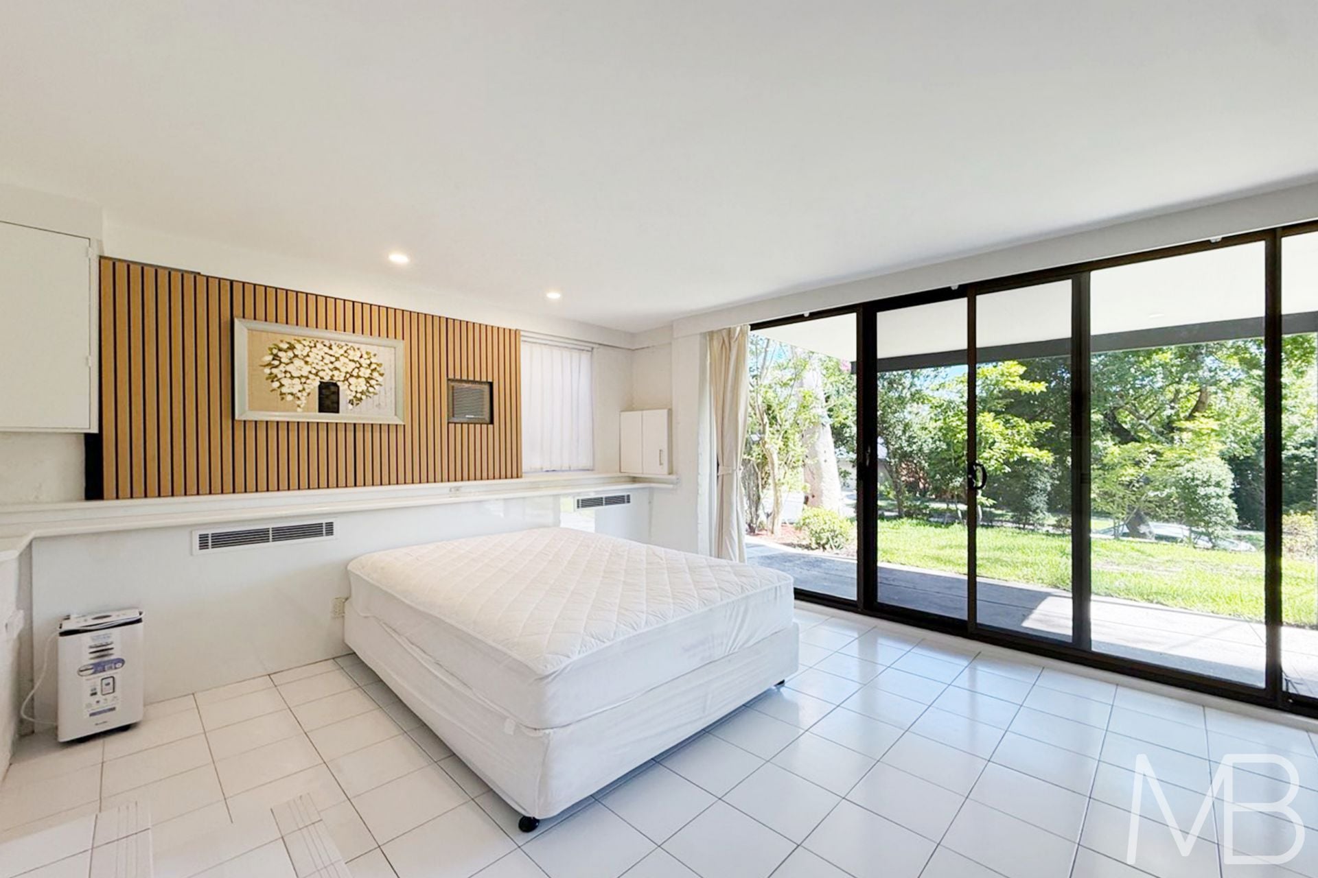 Well-proportioned bedroom area with walk-in wardrobe and floor-to-ceiling windows beside the bed, filled with natural light and green outlook