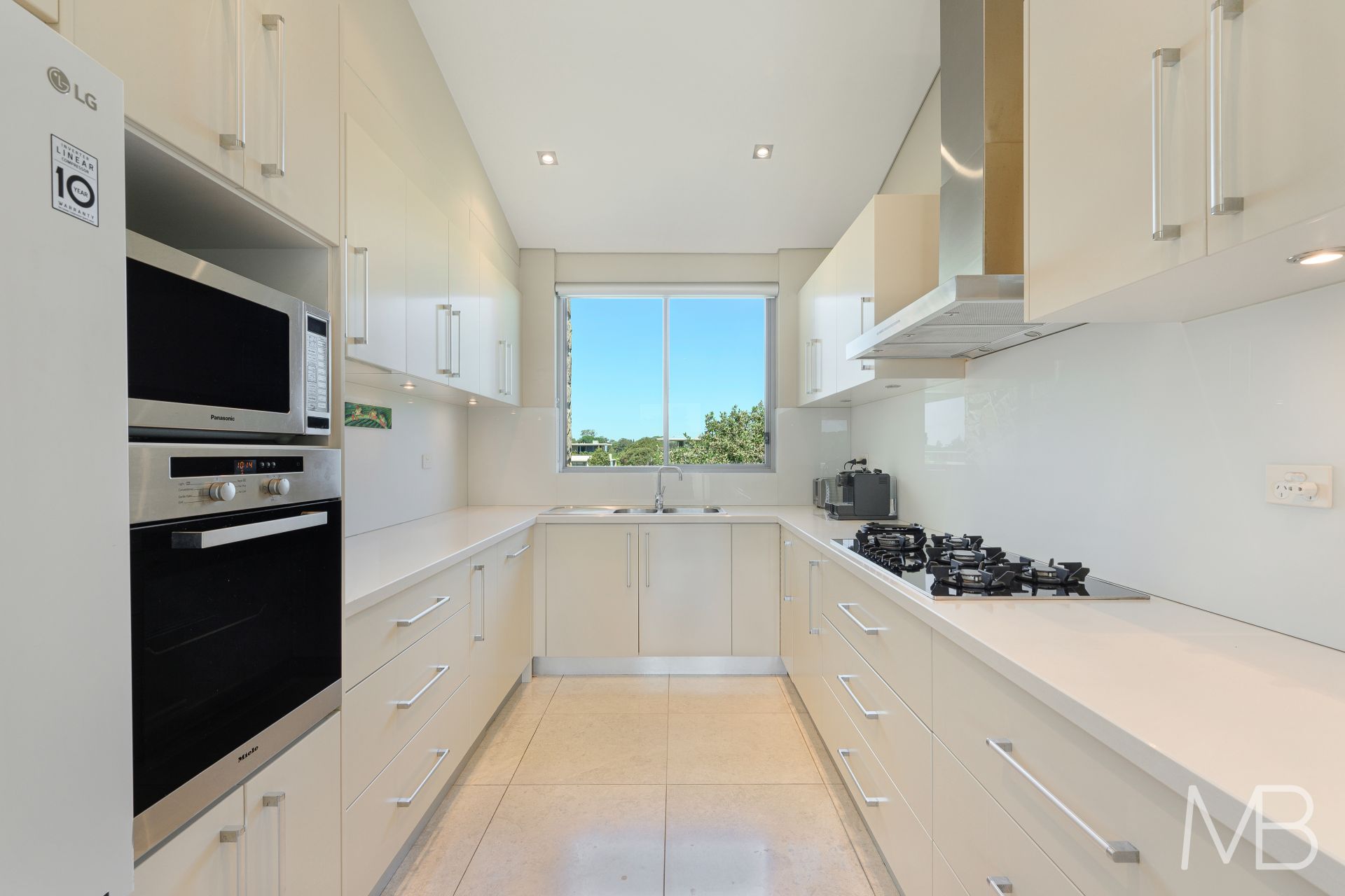 Sleek stone kitchen equipped with Miele appliances, stone benchtops, gas cooktop and dishwasher