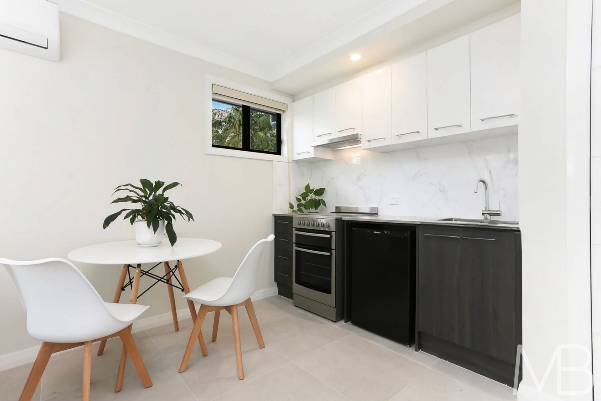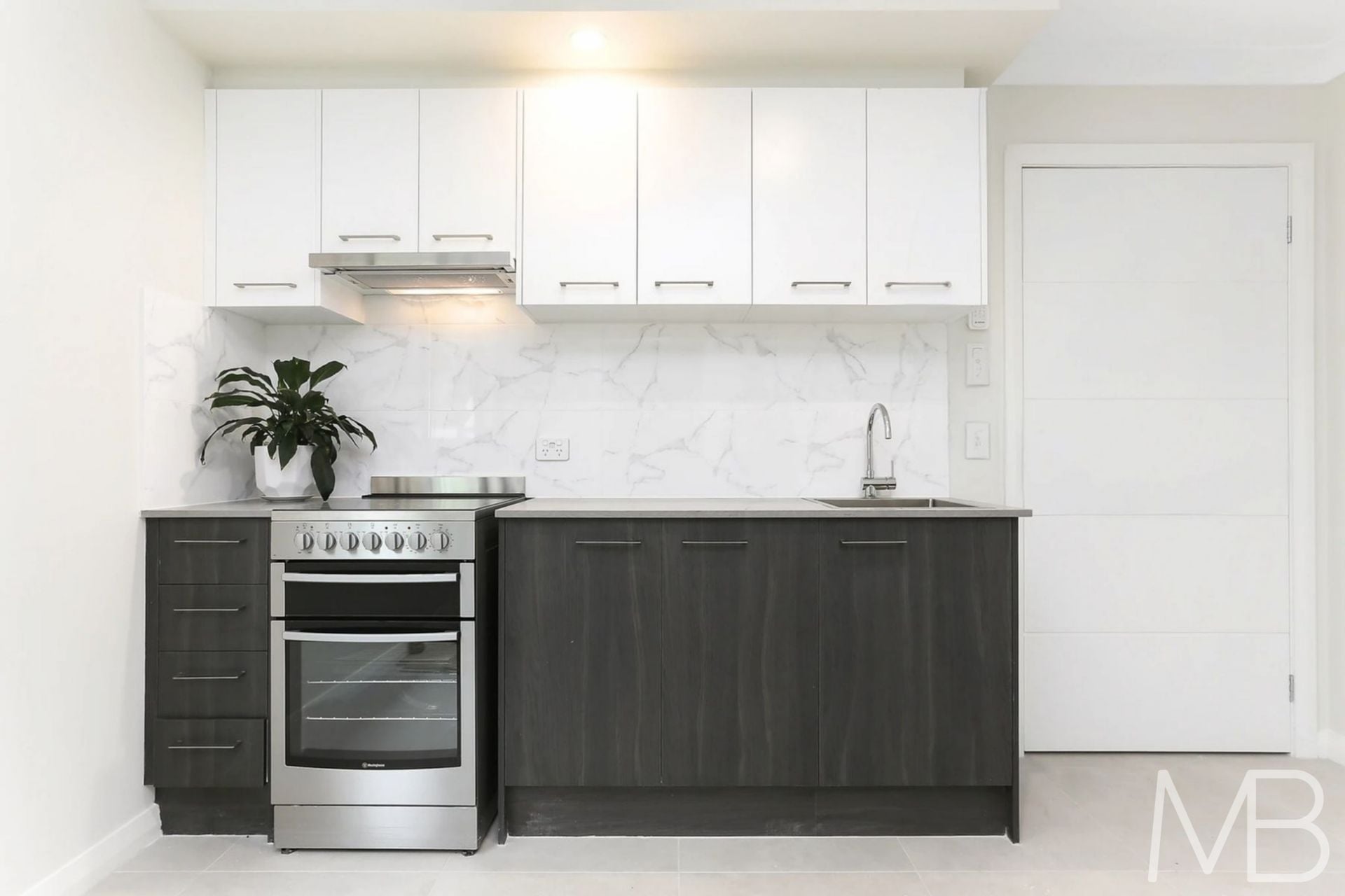 New kitchenette with electric cooktop, oven and fridge