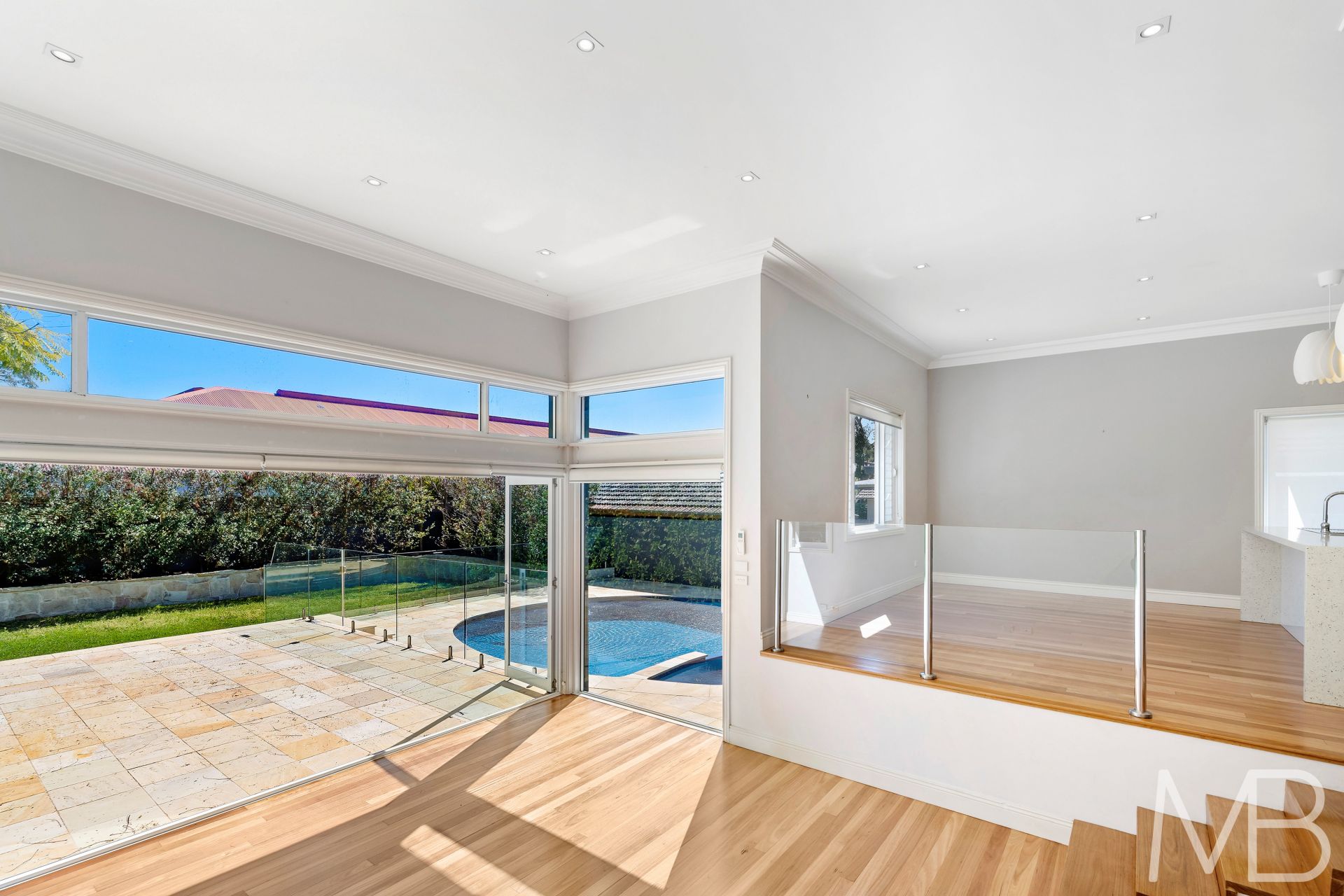 The beautiful entry leads past a formal living area and two bedrooms before opening to a stunning indoor-outdoor entertaining space, level yard and sparkling pool