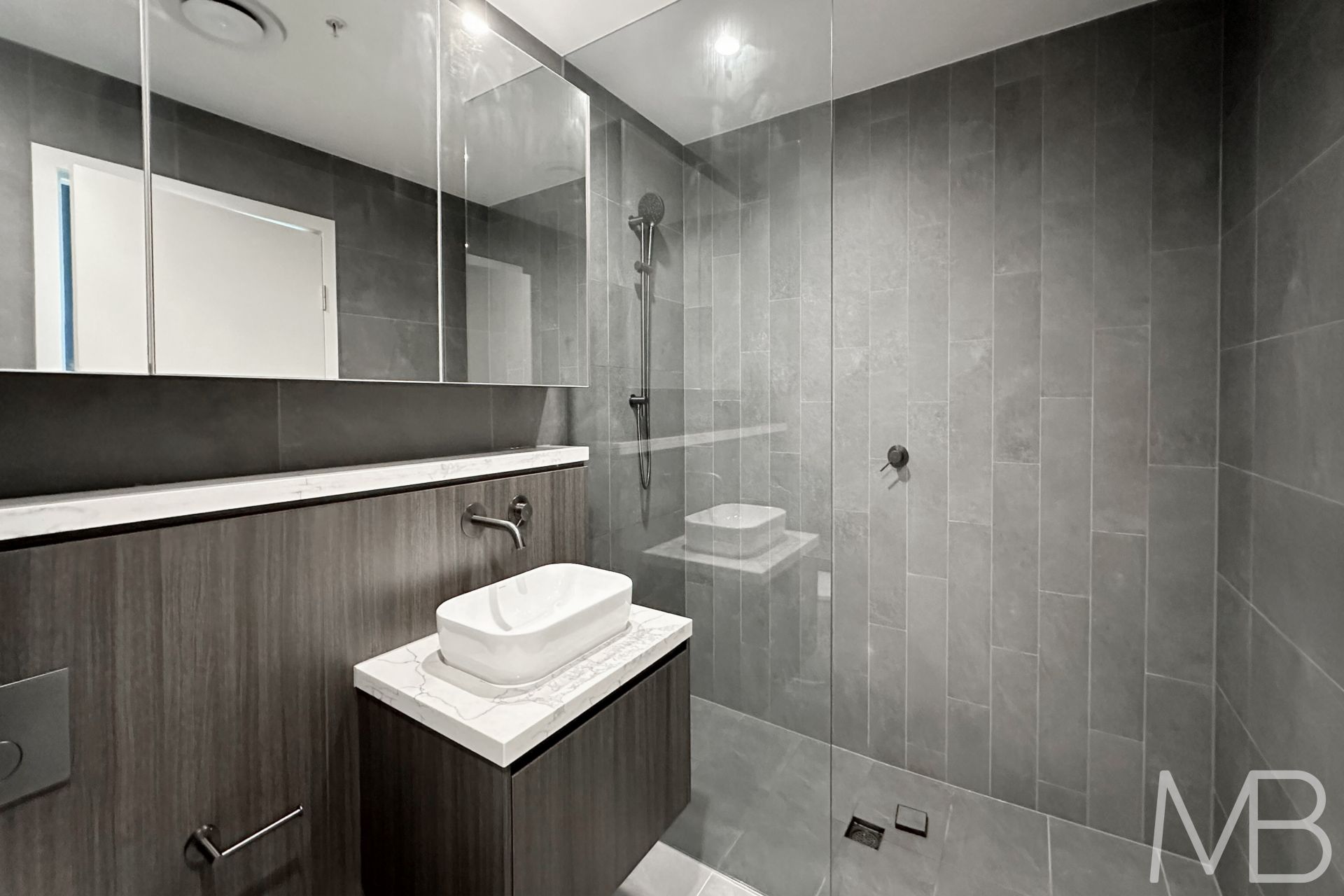 Sleek bathrooms with timber-accented wall tiles, frameless glass showers, designer-lit mirrored cabinets, and concealed cisterns for a modern touch