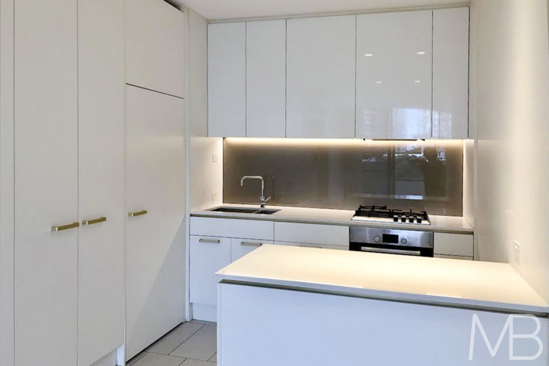 Modern Kitchen with premium finishes include beautiful stone bench with fully integrated Bosch appliances
