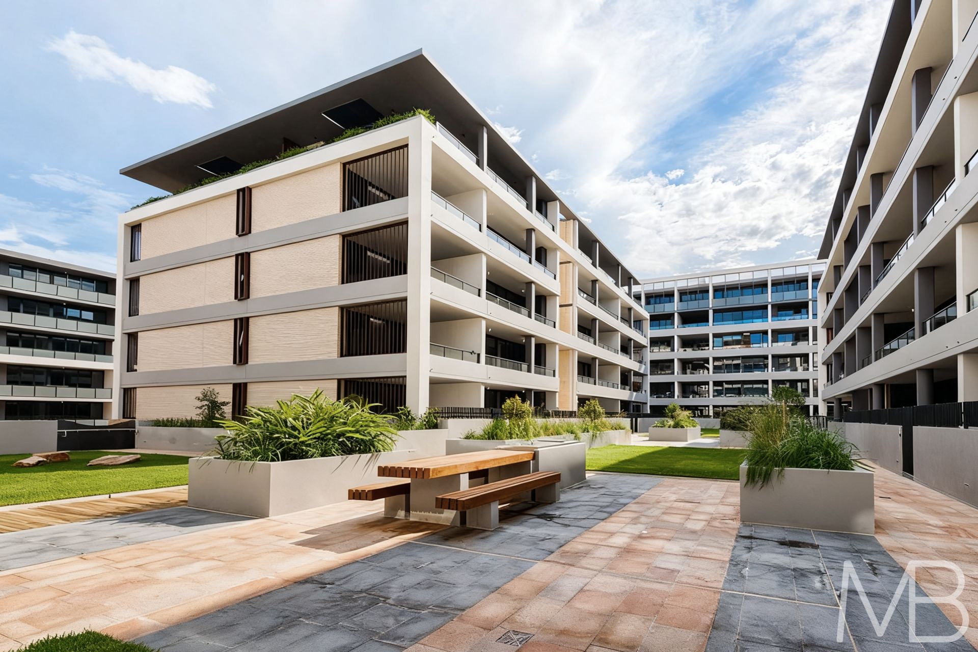 Residents enjoy access to the on-site gym, barbecue facilities, and beautifully landscaped communal gardens