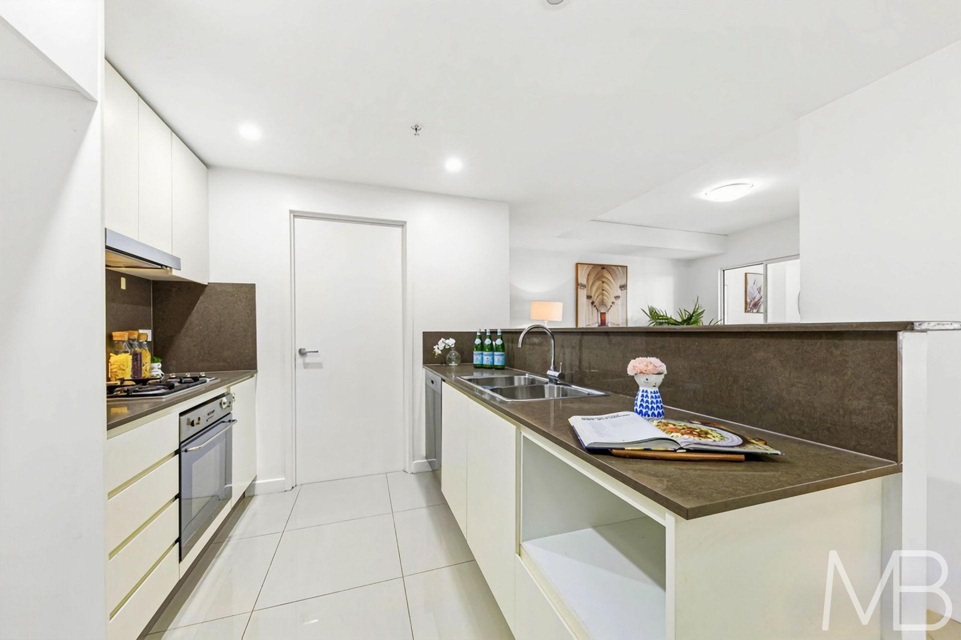 Sleek contemporary kitchen appointed with premium cabinetry, gas cooktop and quality stainless-steel appliances