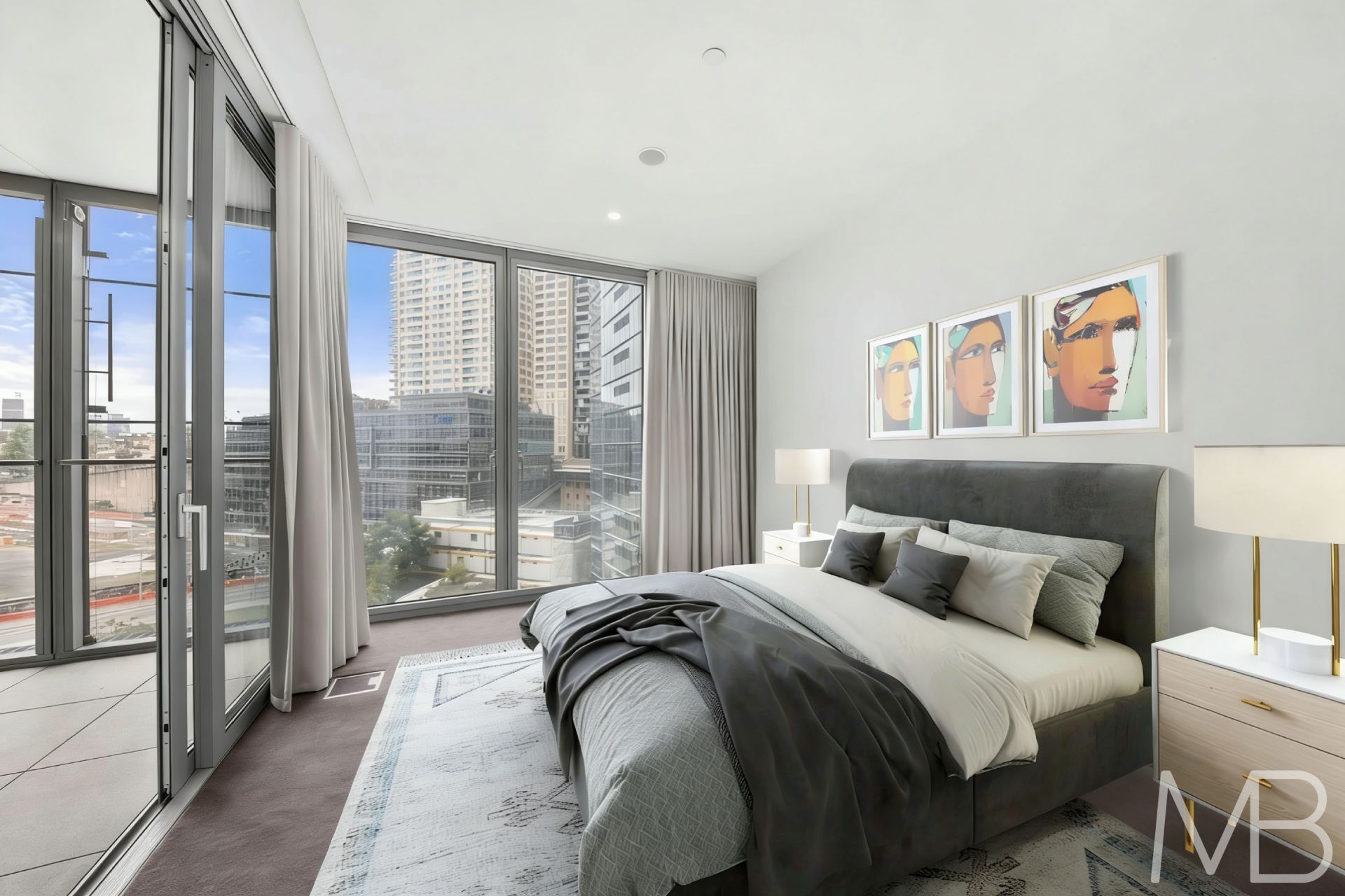 Elegant bedroom with built-in wardrobe and abundant natural light