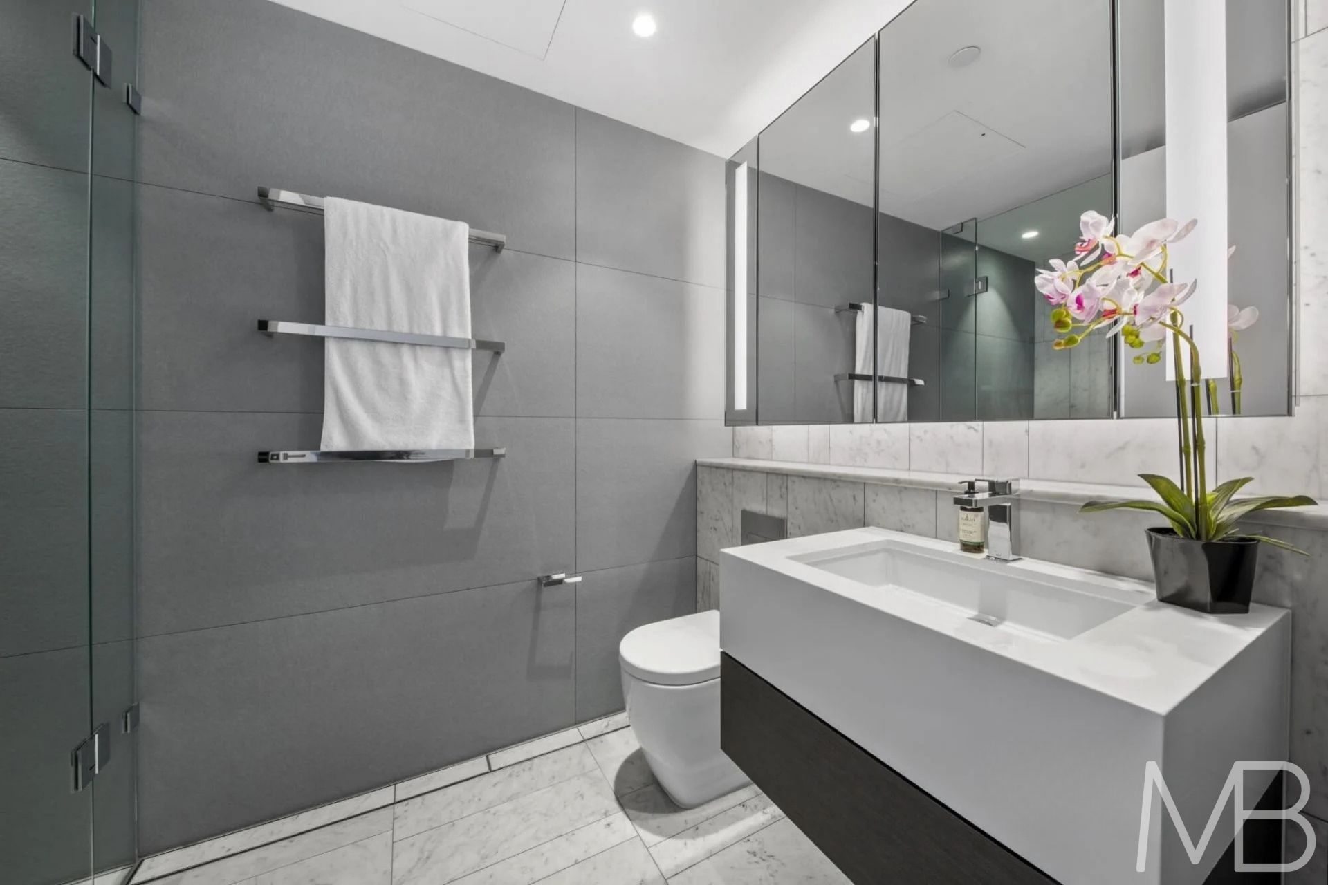 Luxurious bathroom with high-end fittings and mirrored cabinetry