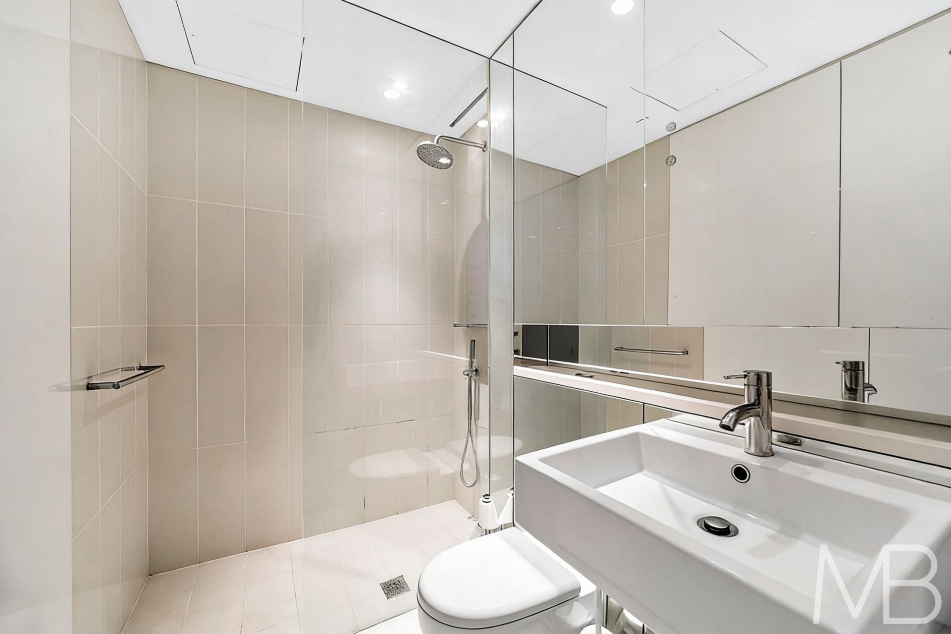 Stylish modern bathroom with frameless glass shower and mirrored cabinetry