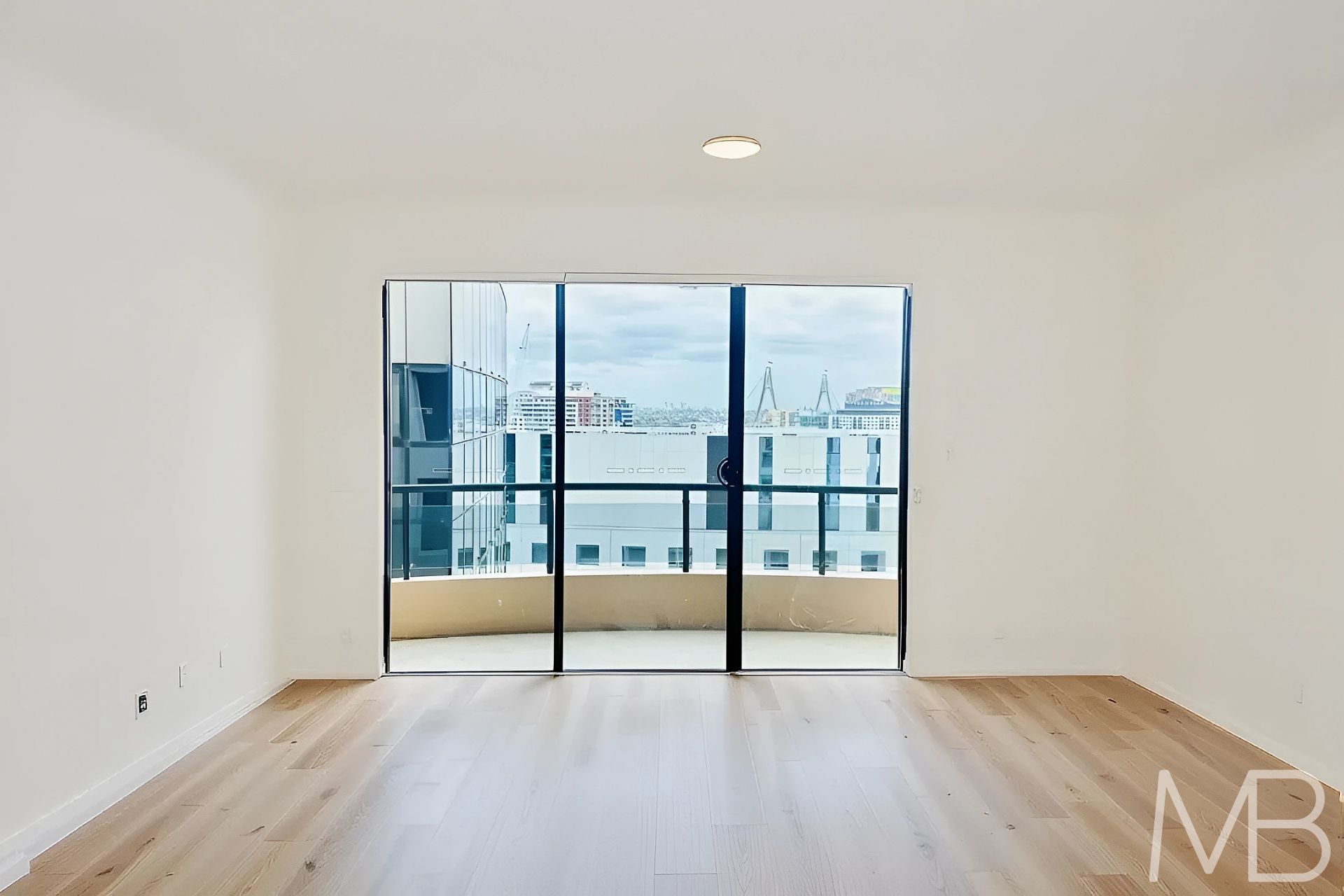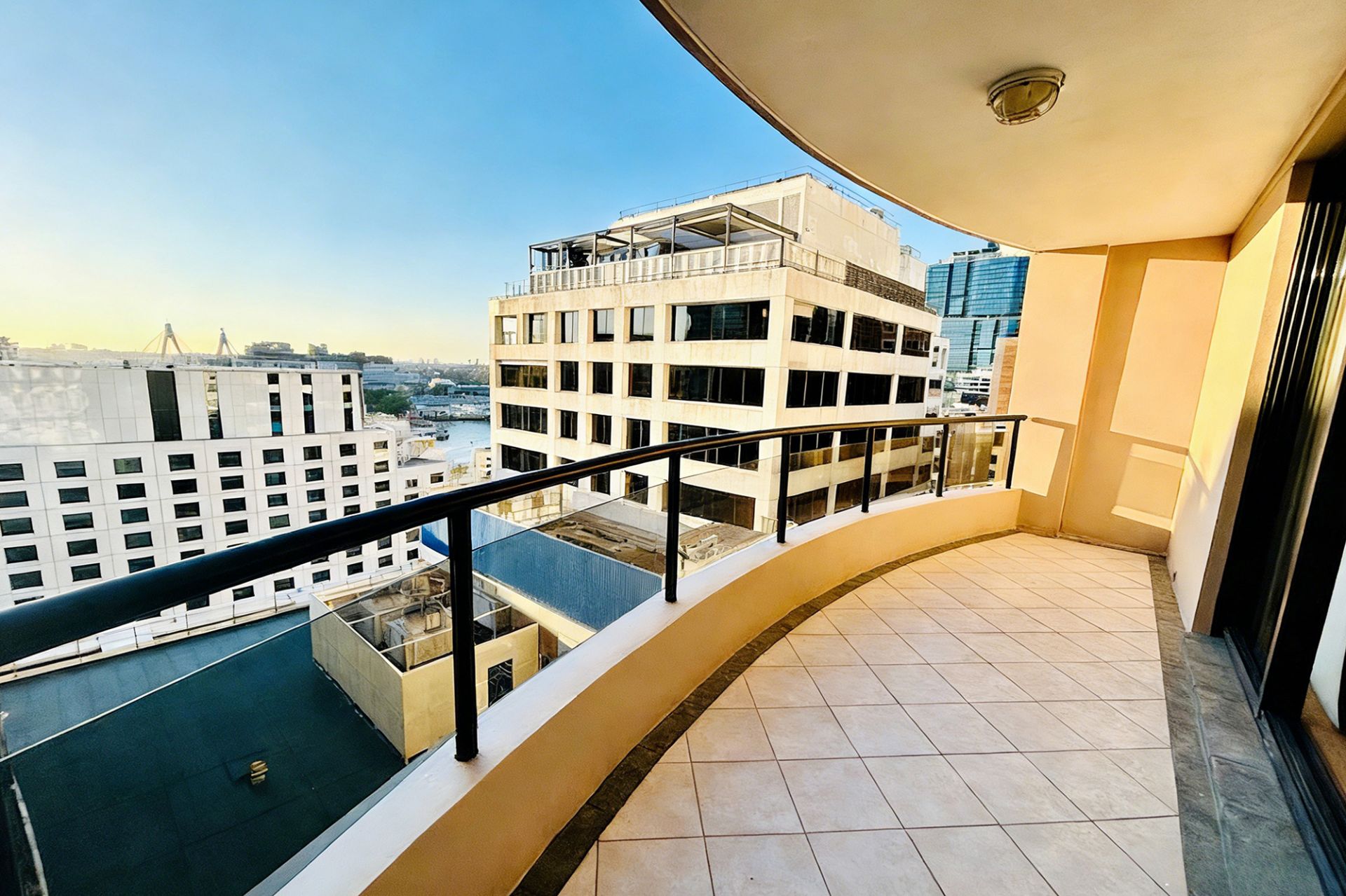 Oversized windows capture sweeping views of Darling Harbour and the Anzac Bridge skyline, bathing the interiors with natural light and warmth