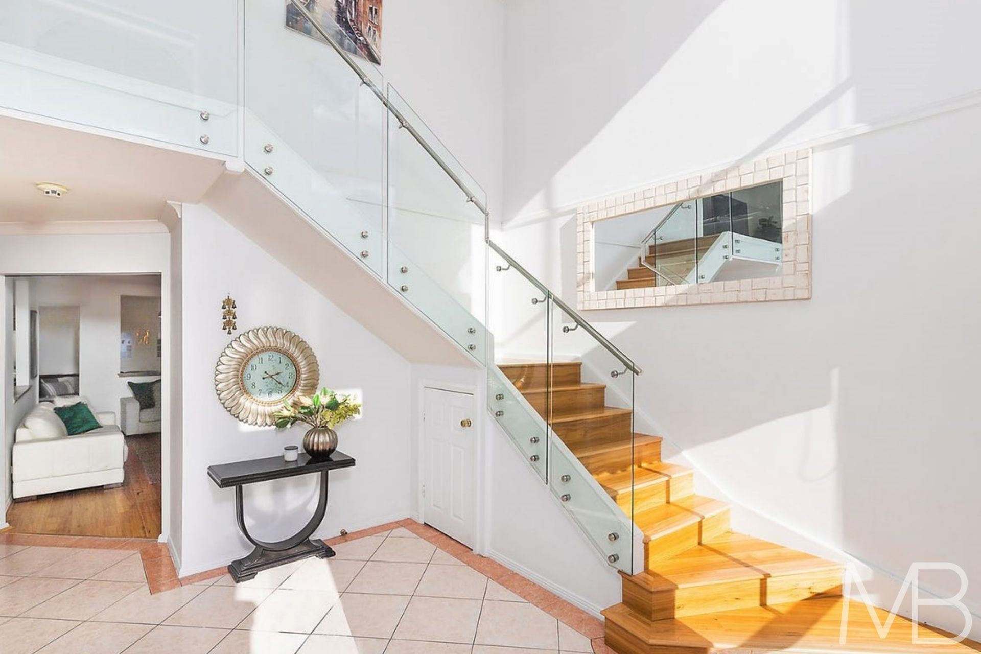 Two-storey foyer, beautiful timber stairs, glass balustrades