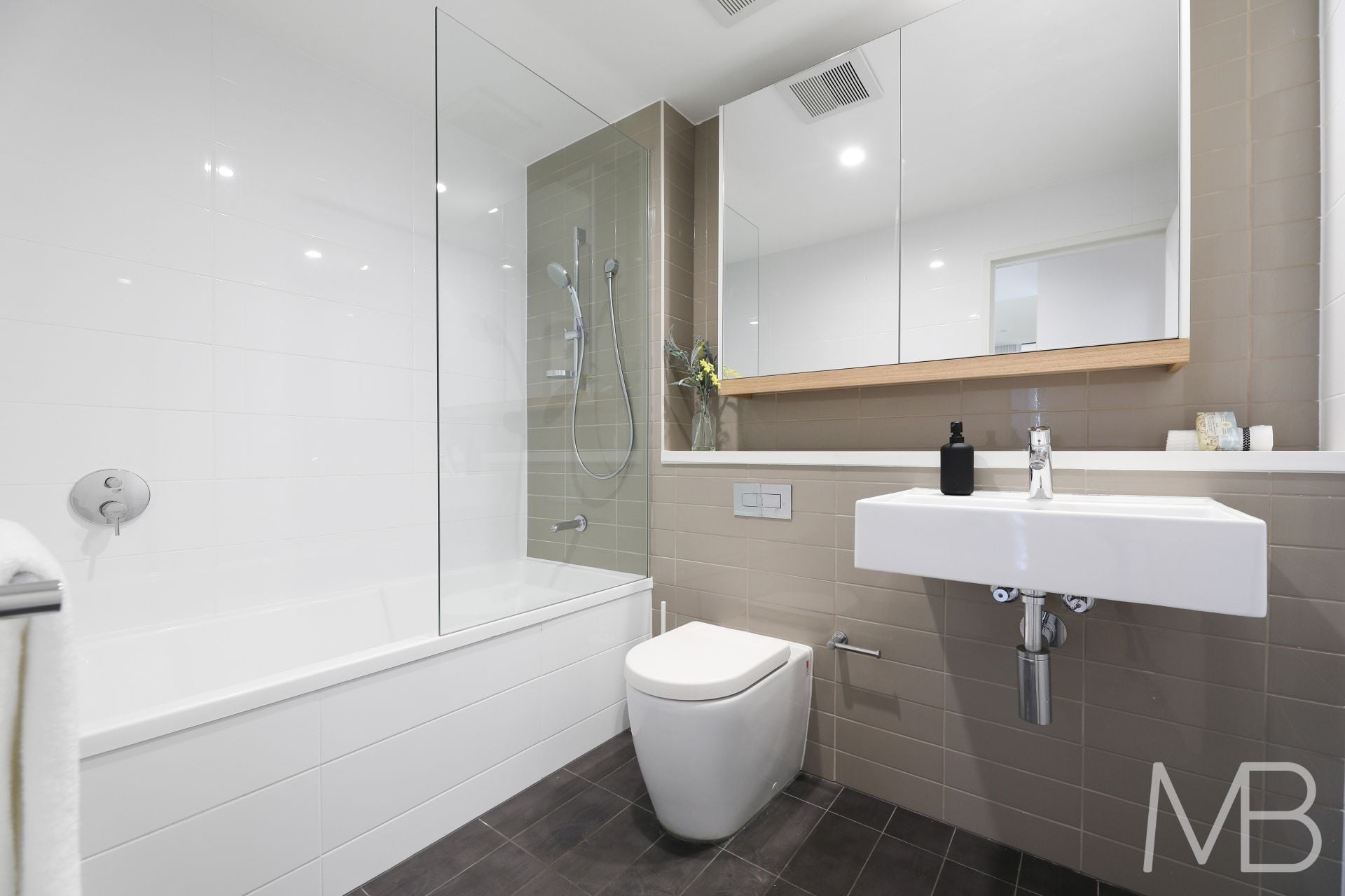 Main bathroom revealing separate tub and shower