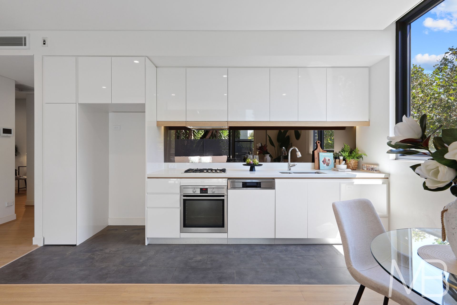 Stylish kitchen with high quality appliances, gas cooking and dishwasher