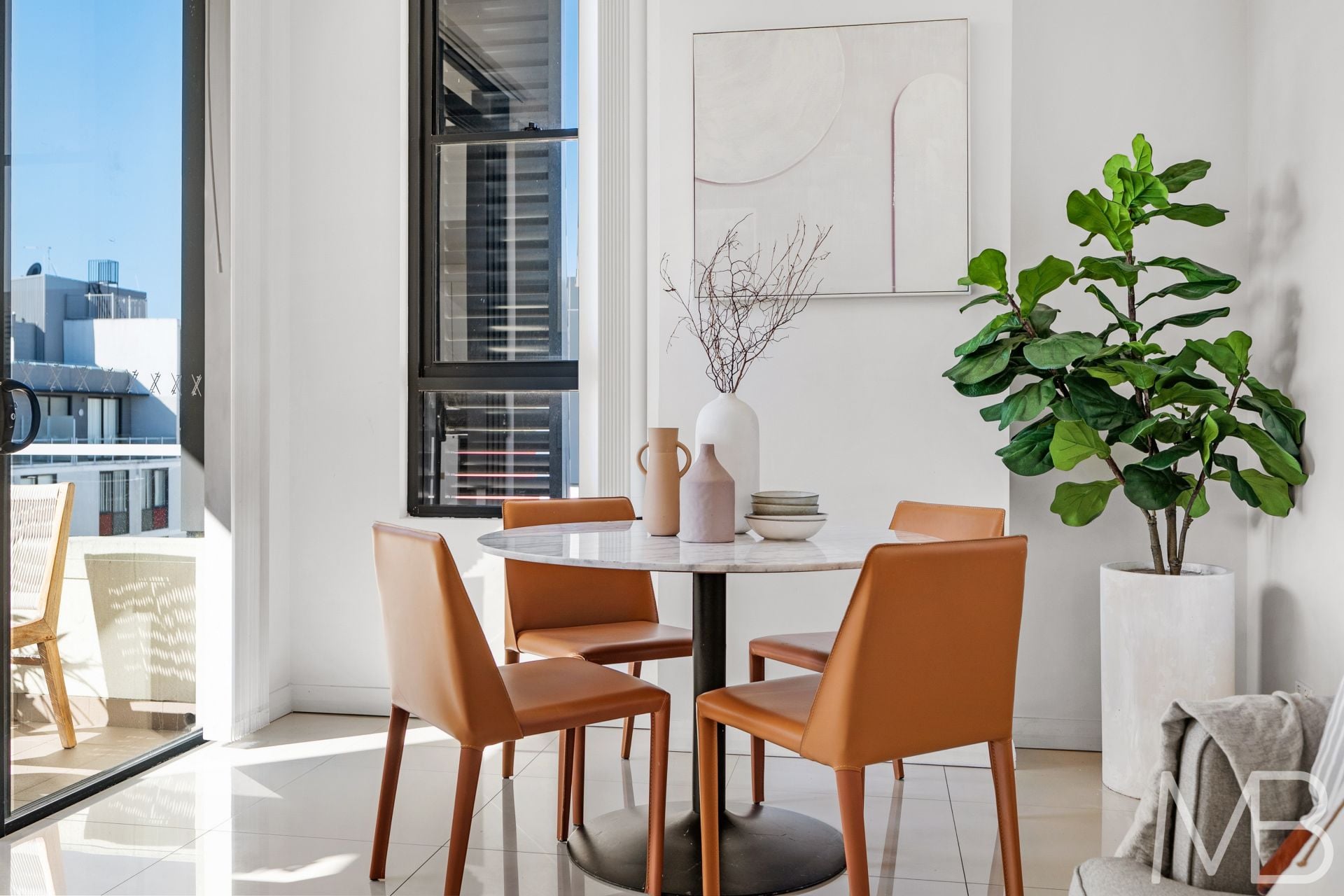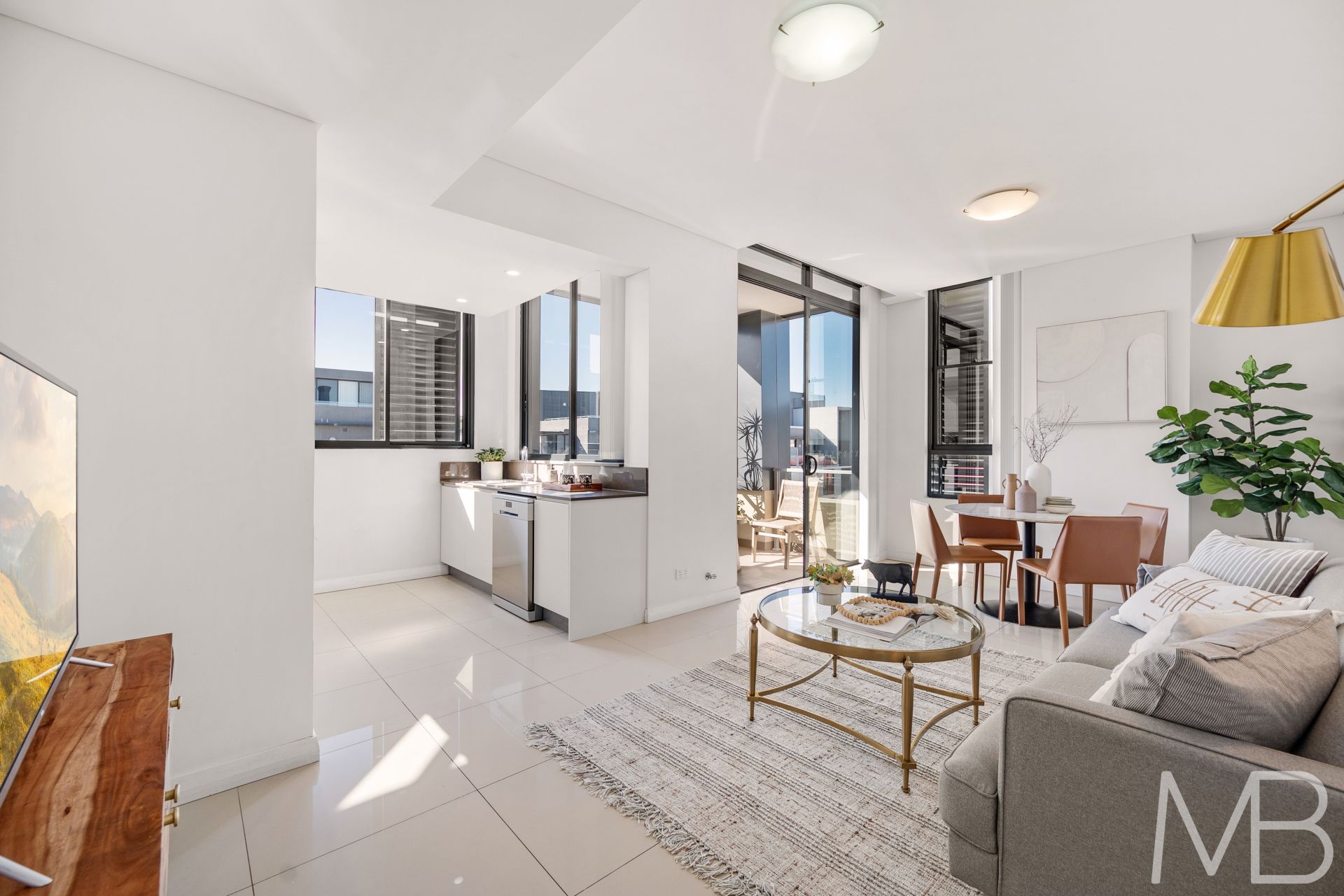 Open plan living and dining area flowing onto a sun-drenched balcony