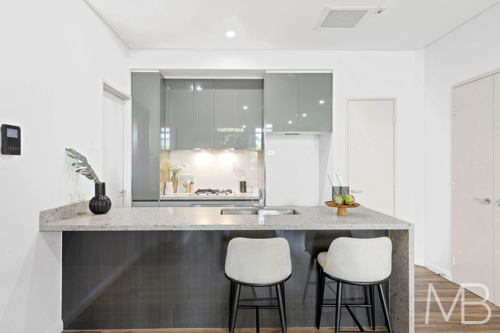 Stylish kitchen with high quality appliances, gas cooking and dishwasher