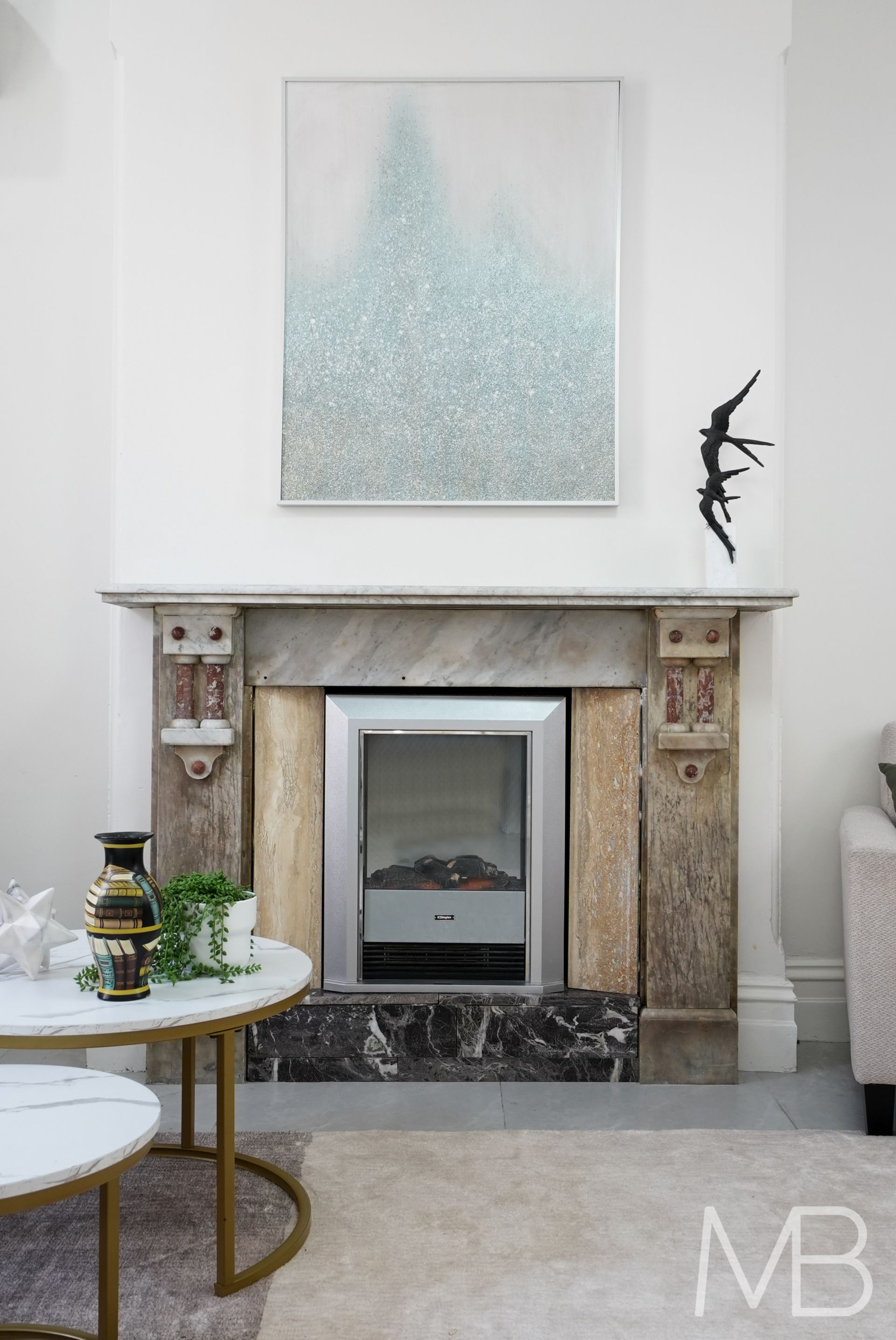 Bright living room filled with natural light, featuring a fireplace, traditional sash windows, and period detailing, complemented by modern interiors