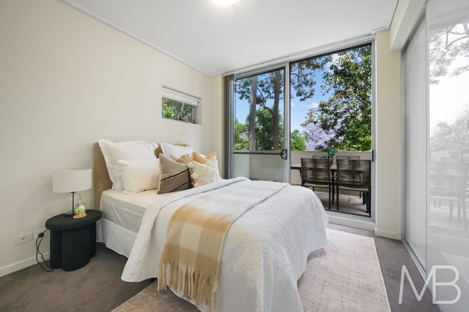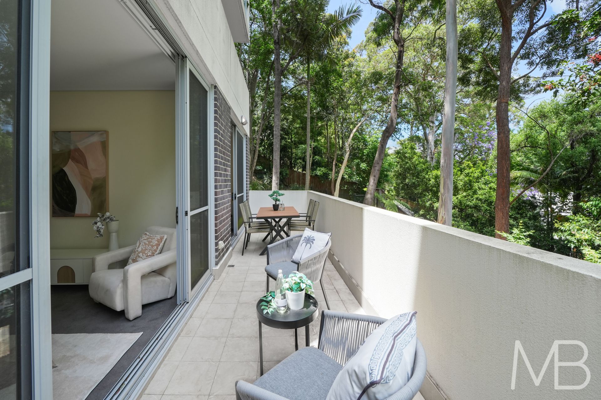 Sun-drenched open-plan living and dining with full-height glass sliding doors flow effortlessly to an expansive, covered balcony framed by lush greenery, ideal for alfresco entertaining or quiet relaxation