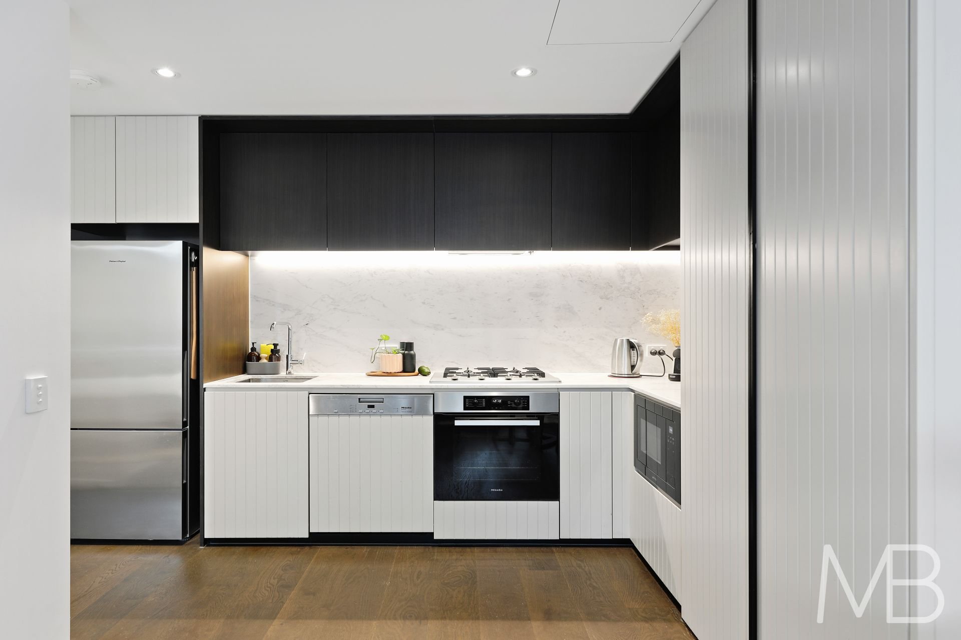 Gourmet gas kitchen appointed with natural stone benchtops and high-end Miele appliances