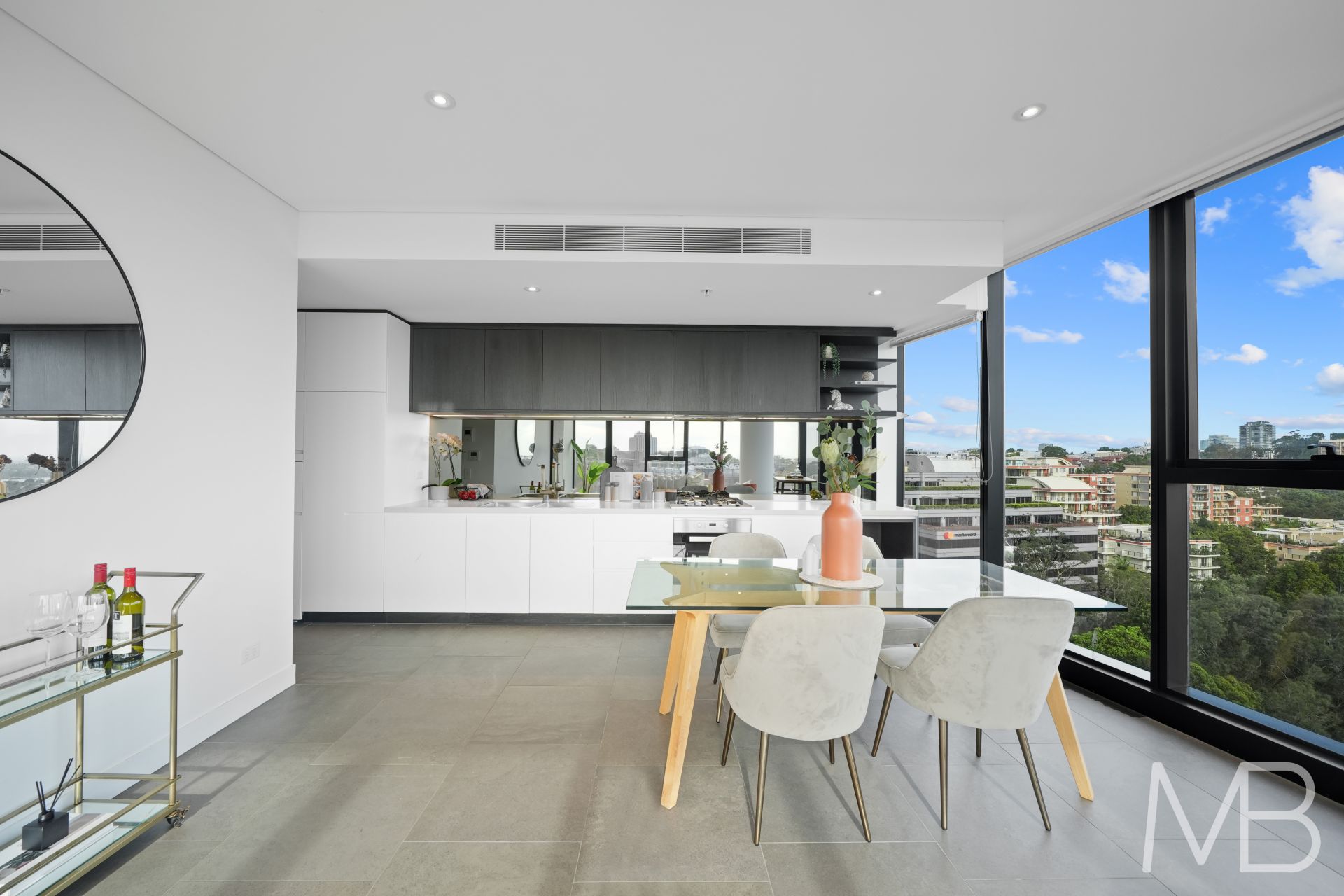 Open plan living/dining floor to ceiling glass windows with heartbreaking city views