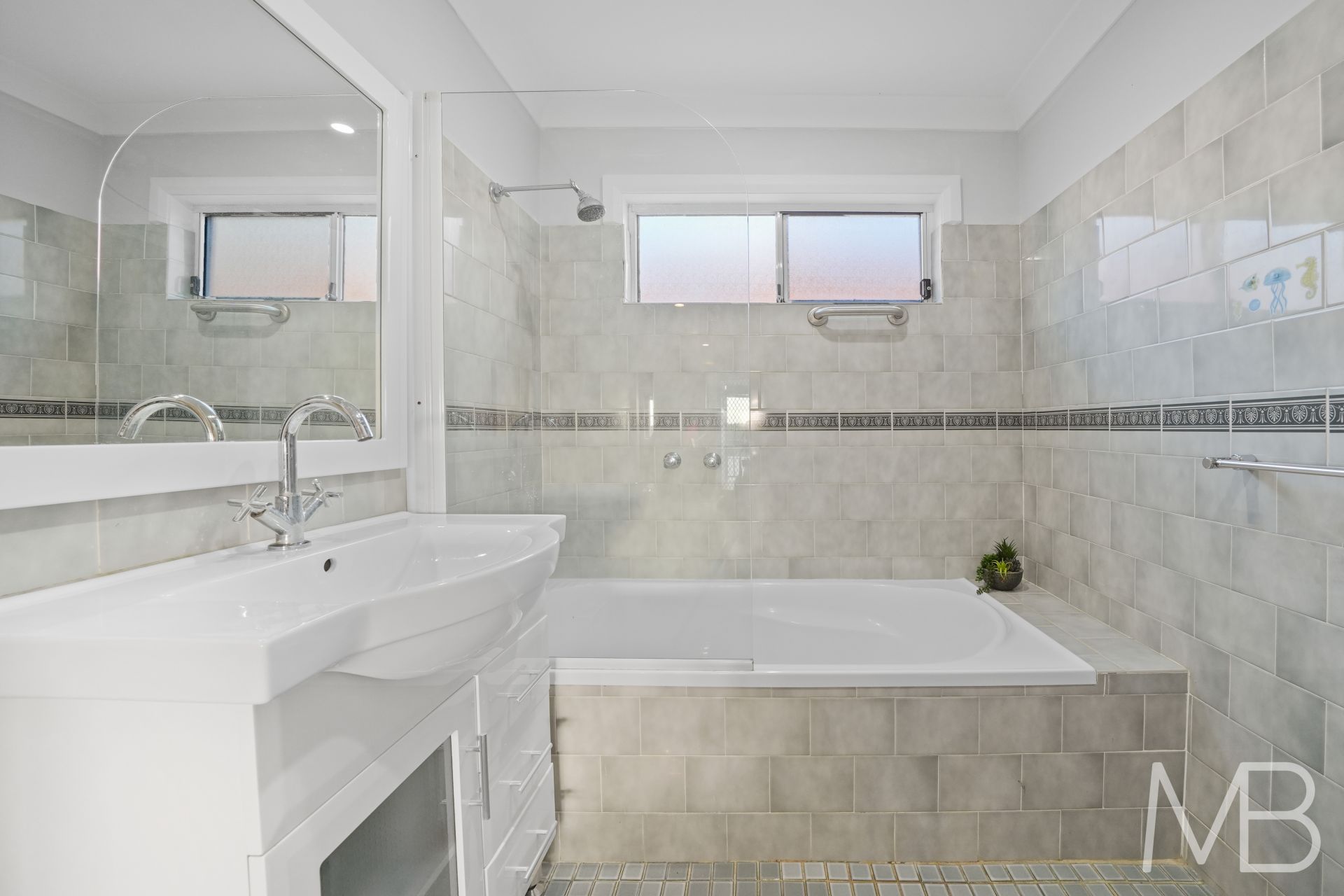 Contemporary main bathroom with combined bath/shower; internal laundry