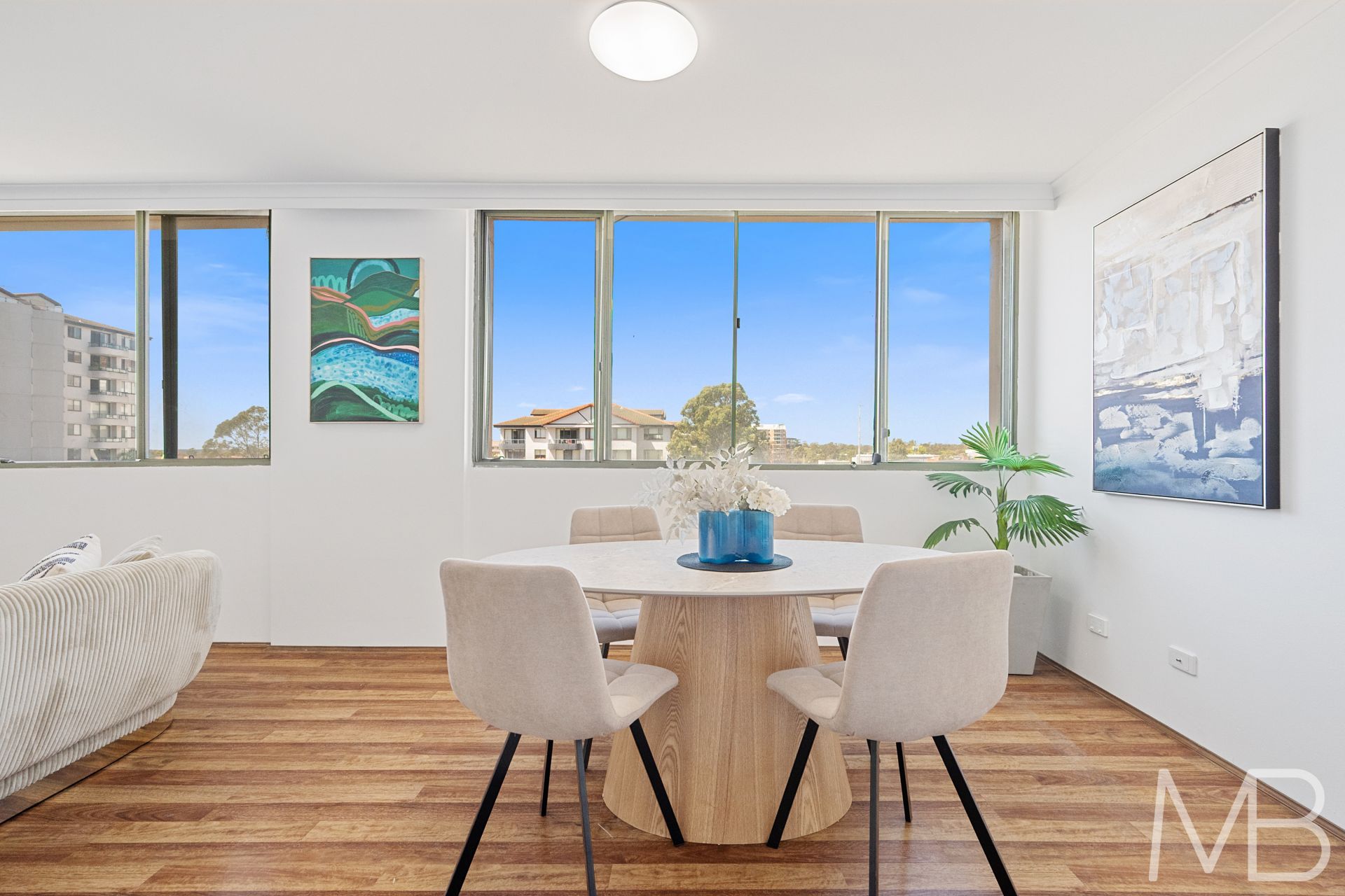 Open-plan living area with timber floors throughout the apartment