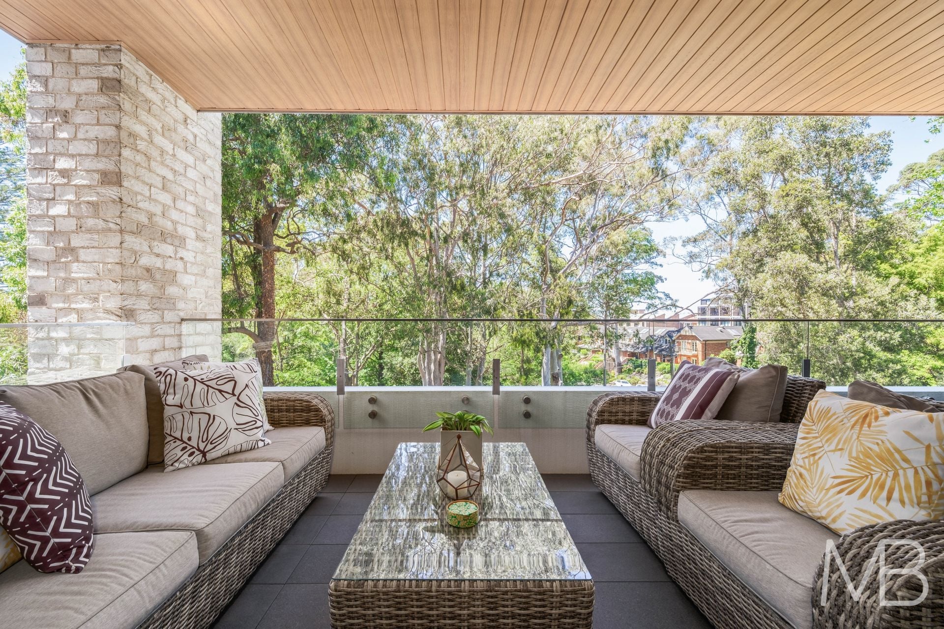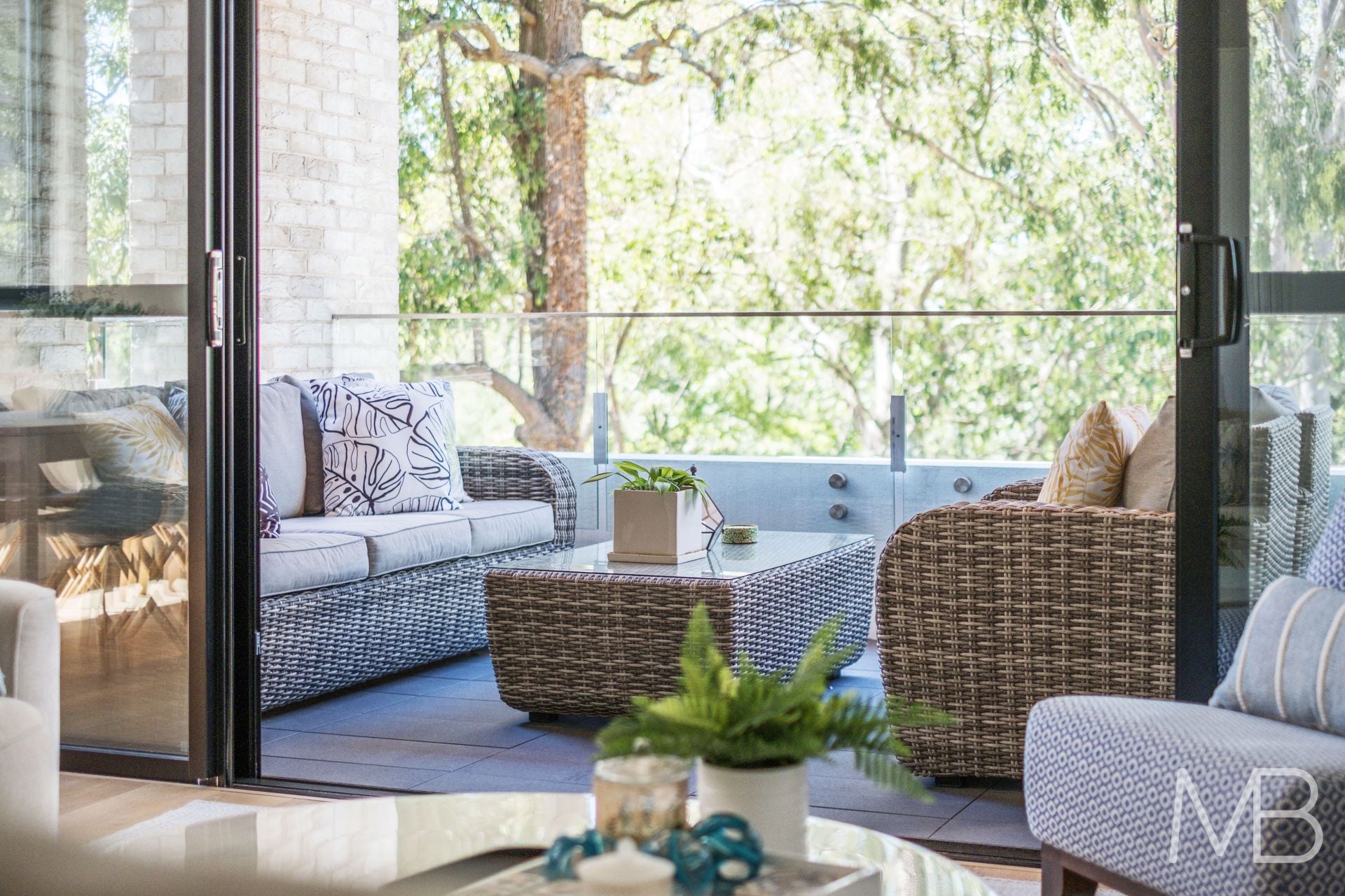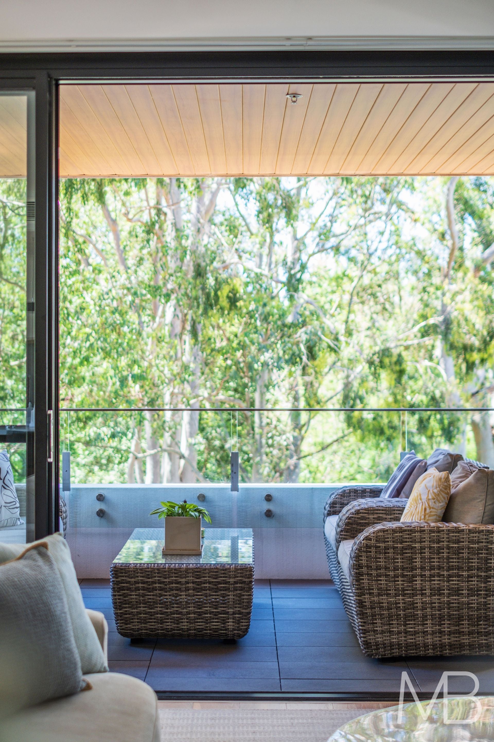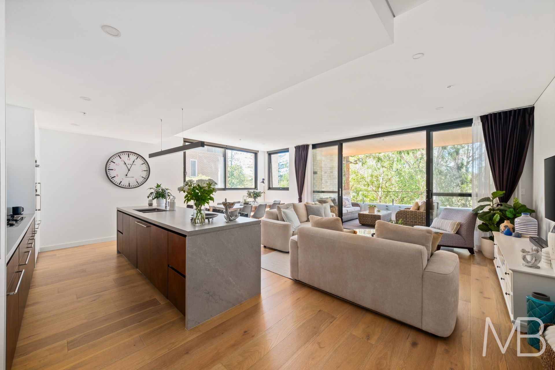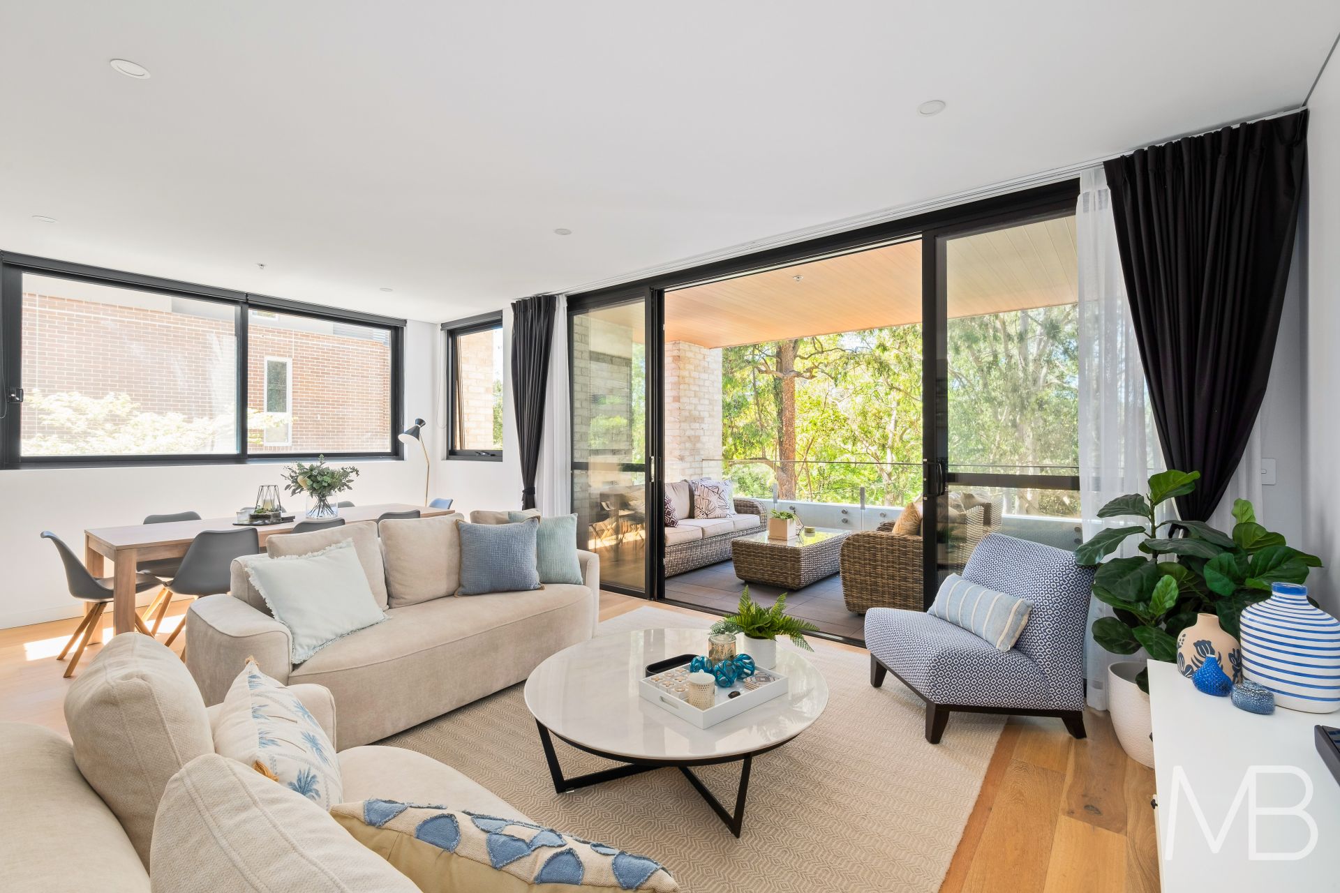 Open-plan design flowing effortlessly onto a spacious balcony with tranquil, leafy views