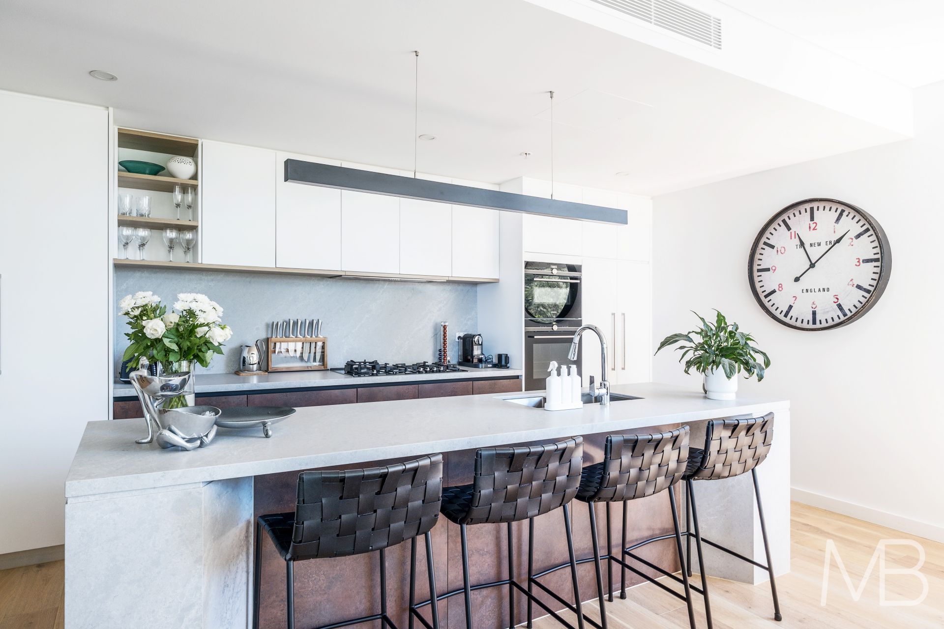 Ample storage is thoughtfully incorporated beneath the stone island benchtop, complemented by refined stone finishes and elegant LED under-cabinet lighting