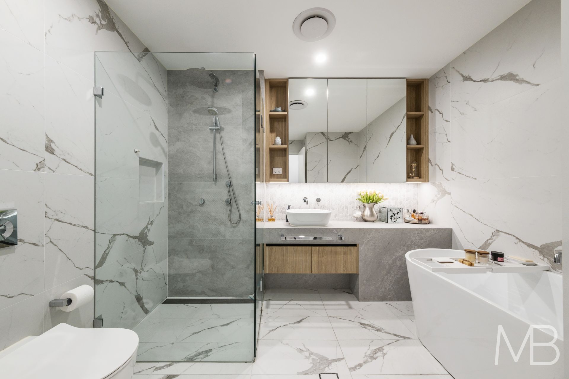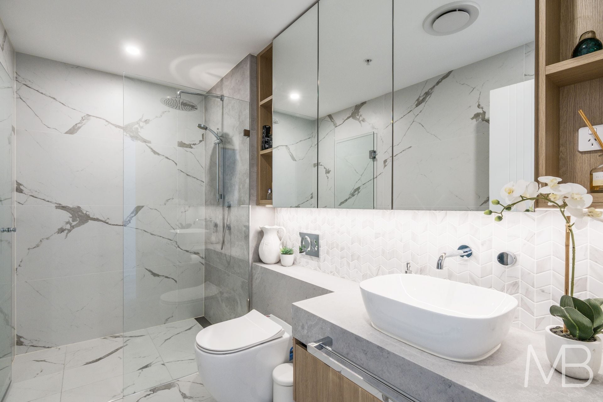 Three luxurious bathrooms featuring high-end fixtures and finishes, creating a refined, spa-like experience