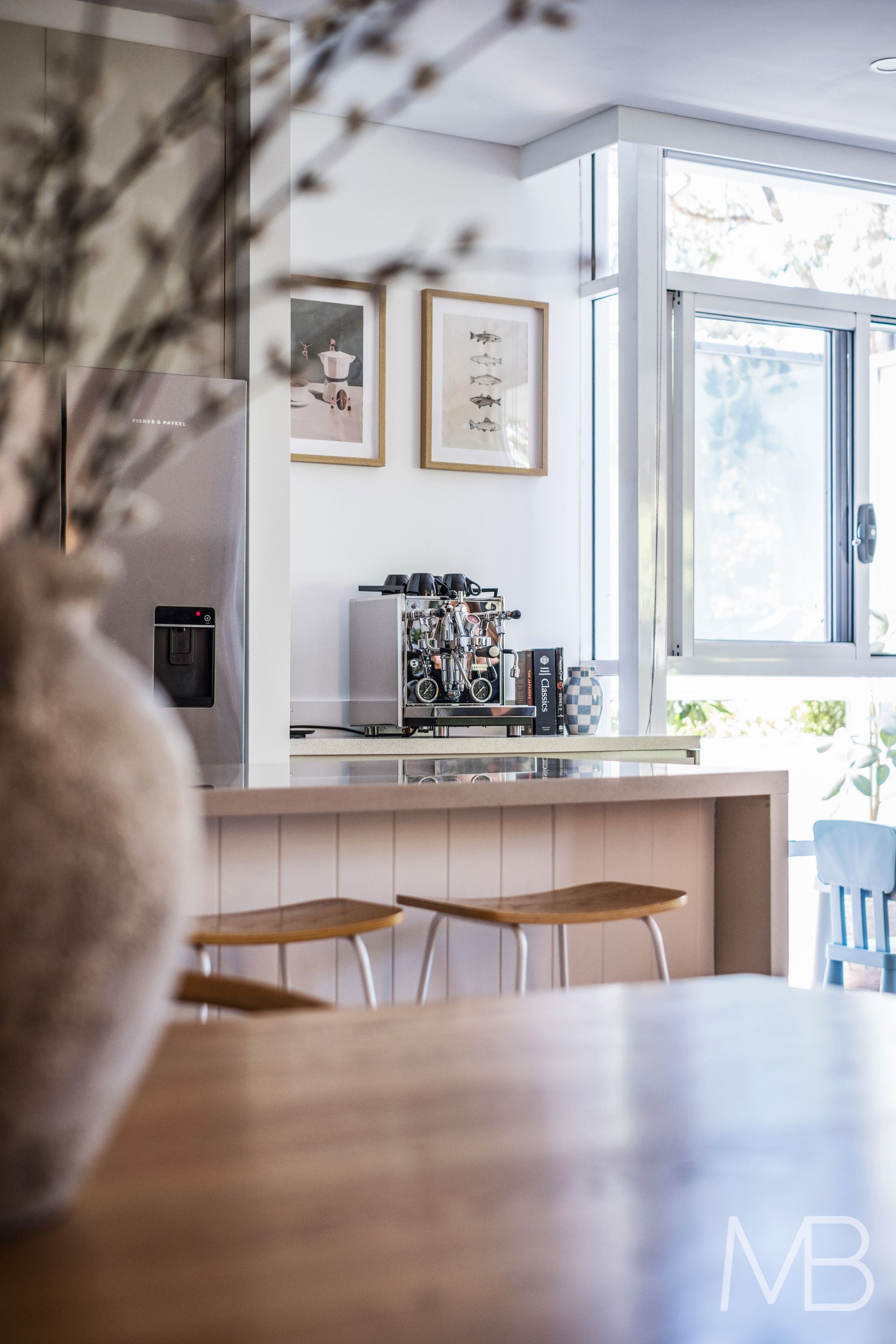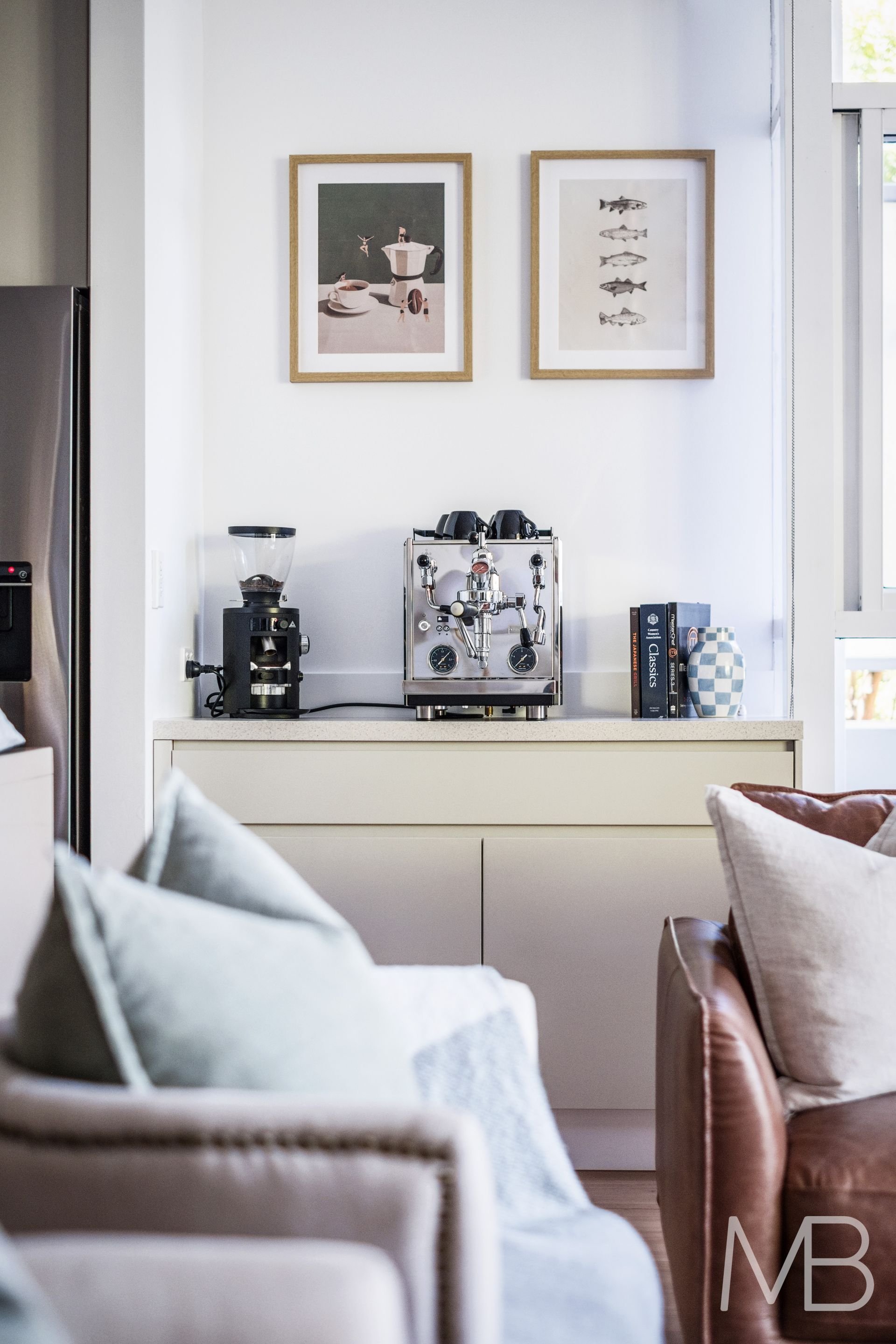 Designer kitchen with premium appliances, stone finishes, and a coffee station