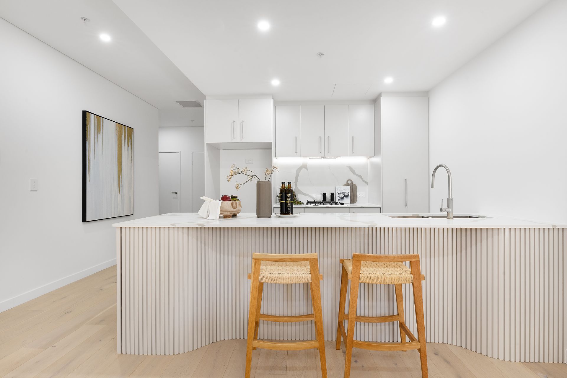 The Kitchen is designed for both beauty and functionality with reconstituted stone benchtop in elegant Calacatta marble and a suite of high-end Fisher & Paykel appliances including an integrated dishwasher
