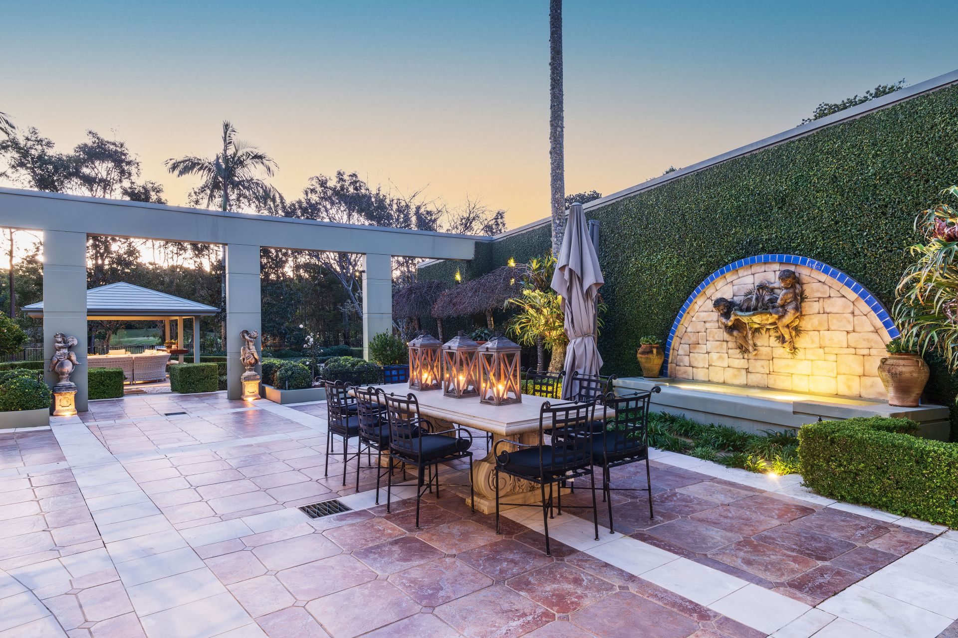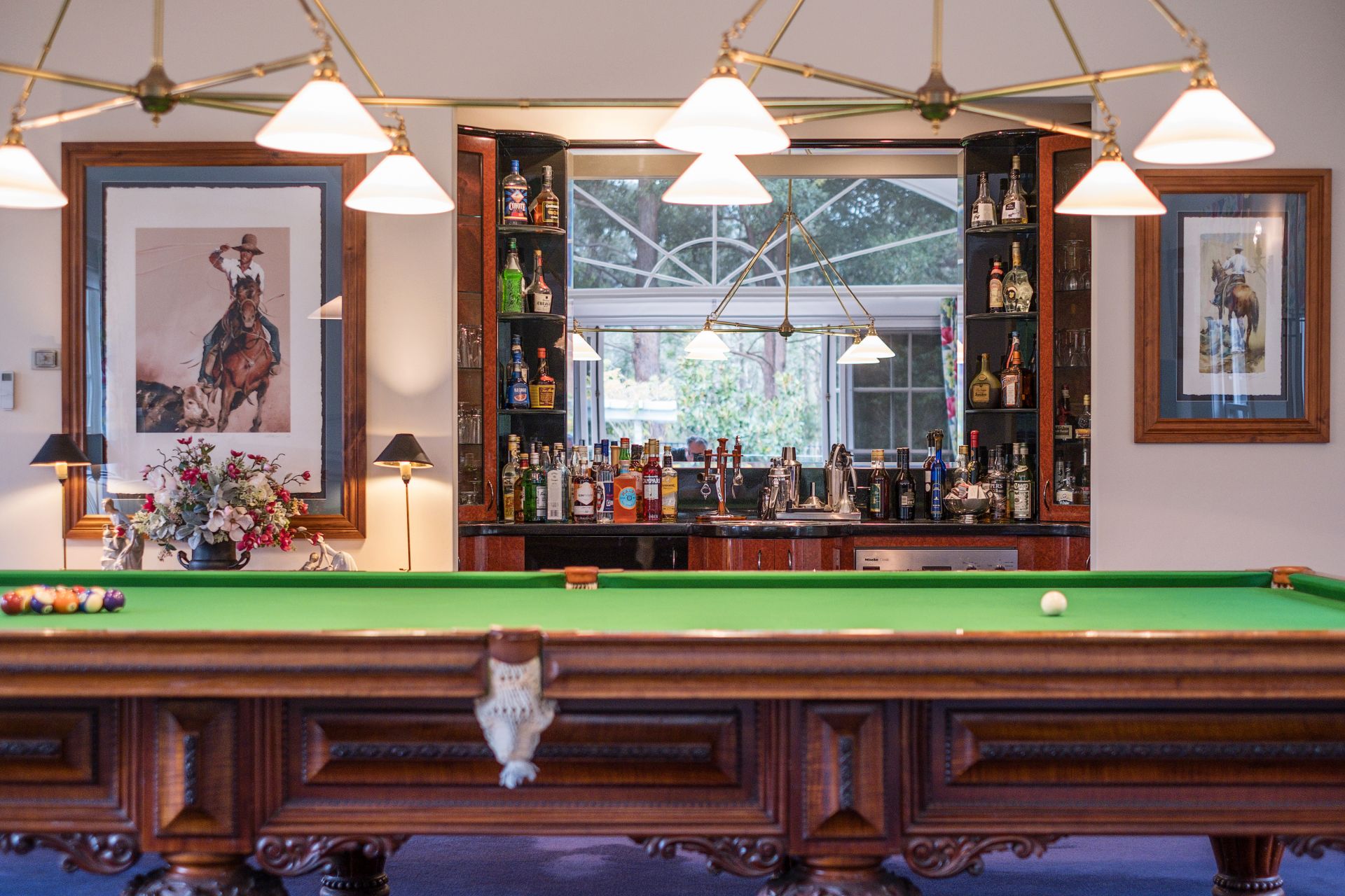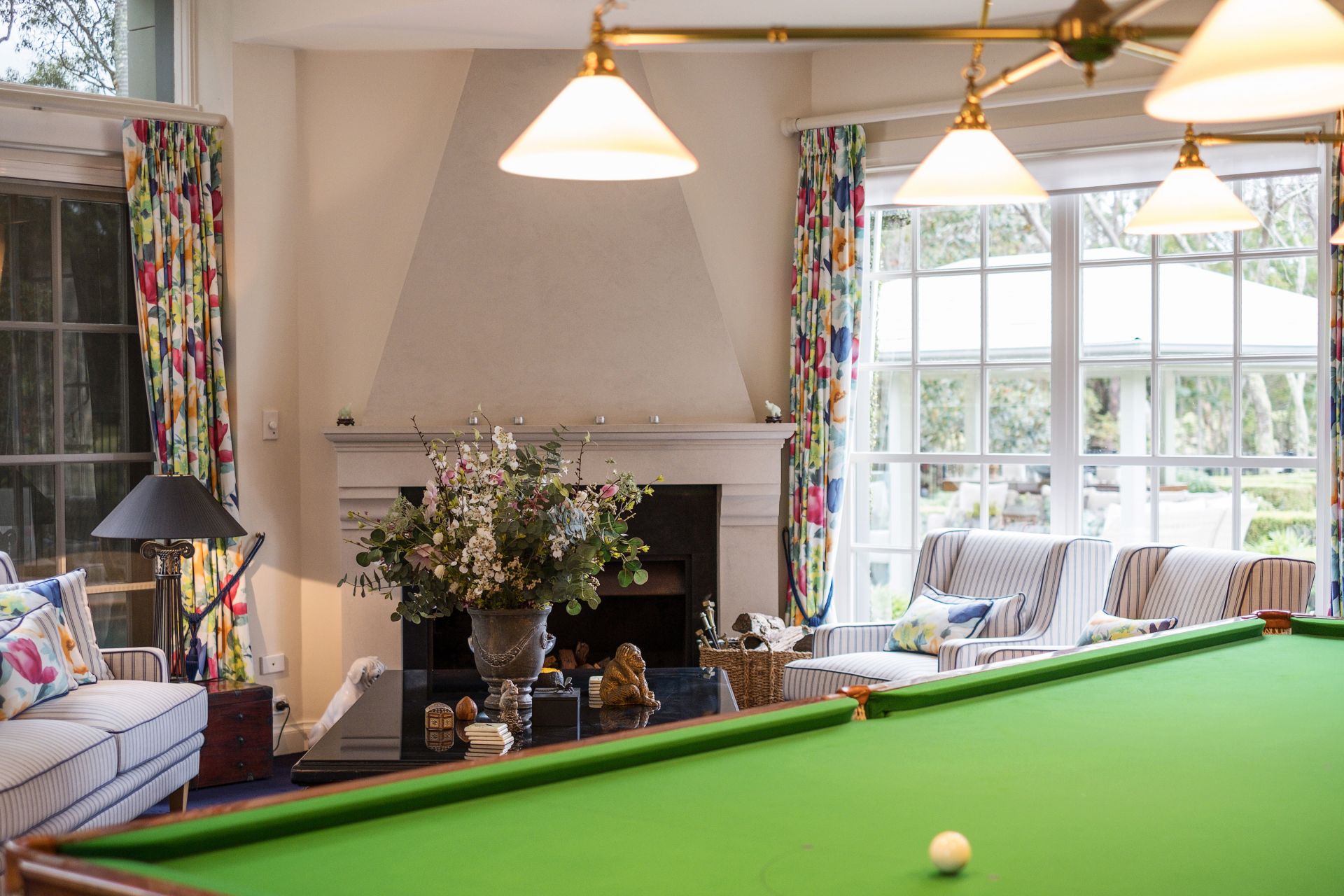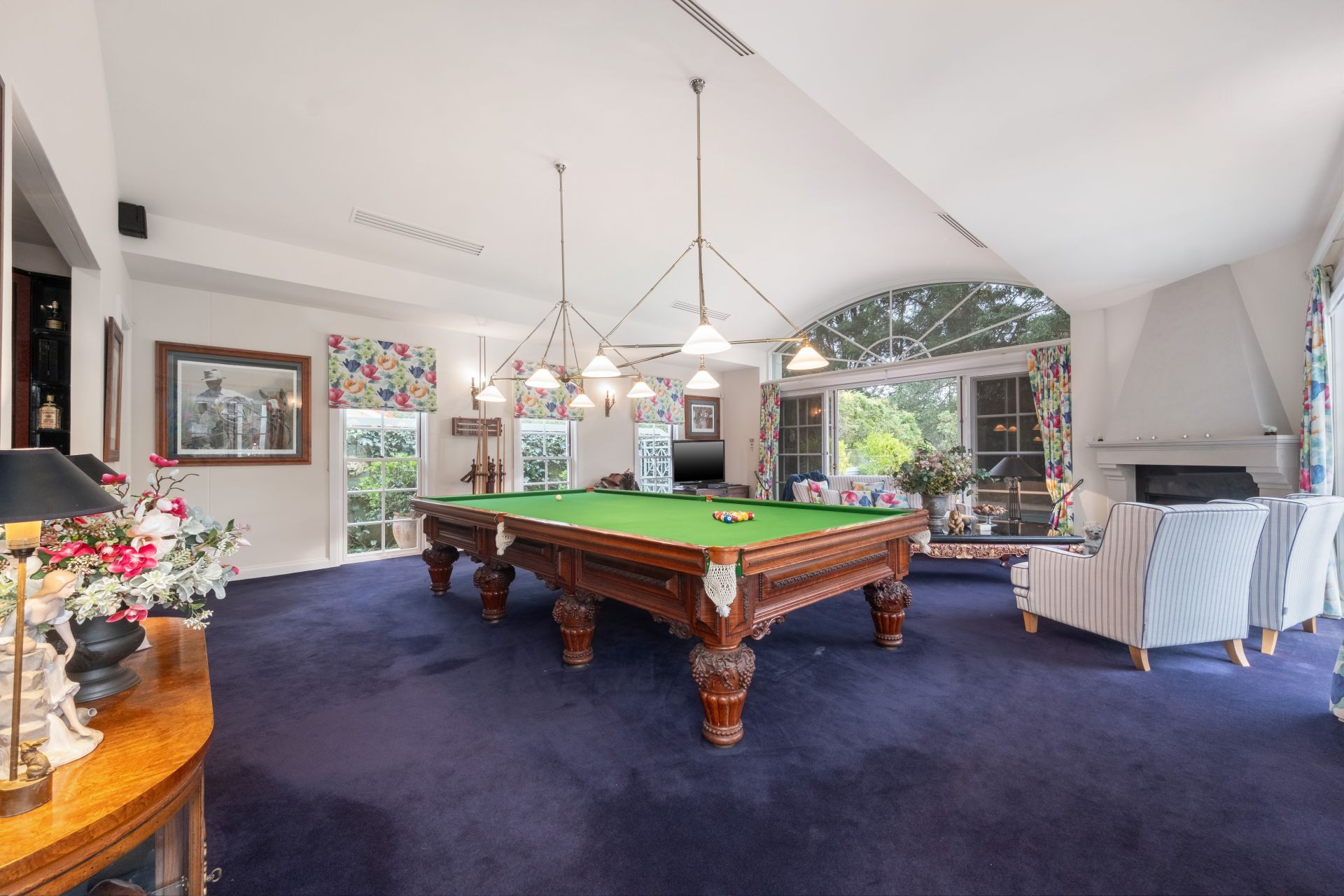 Additionally, the home features a fully fitted study, an additional living/billiard/media room with wet bar and woodburning fireplace, glass sliders lead out to a magnificent, covered entertainer's terrace and a sun drenched pool