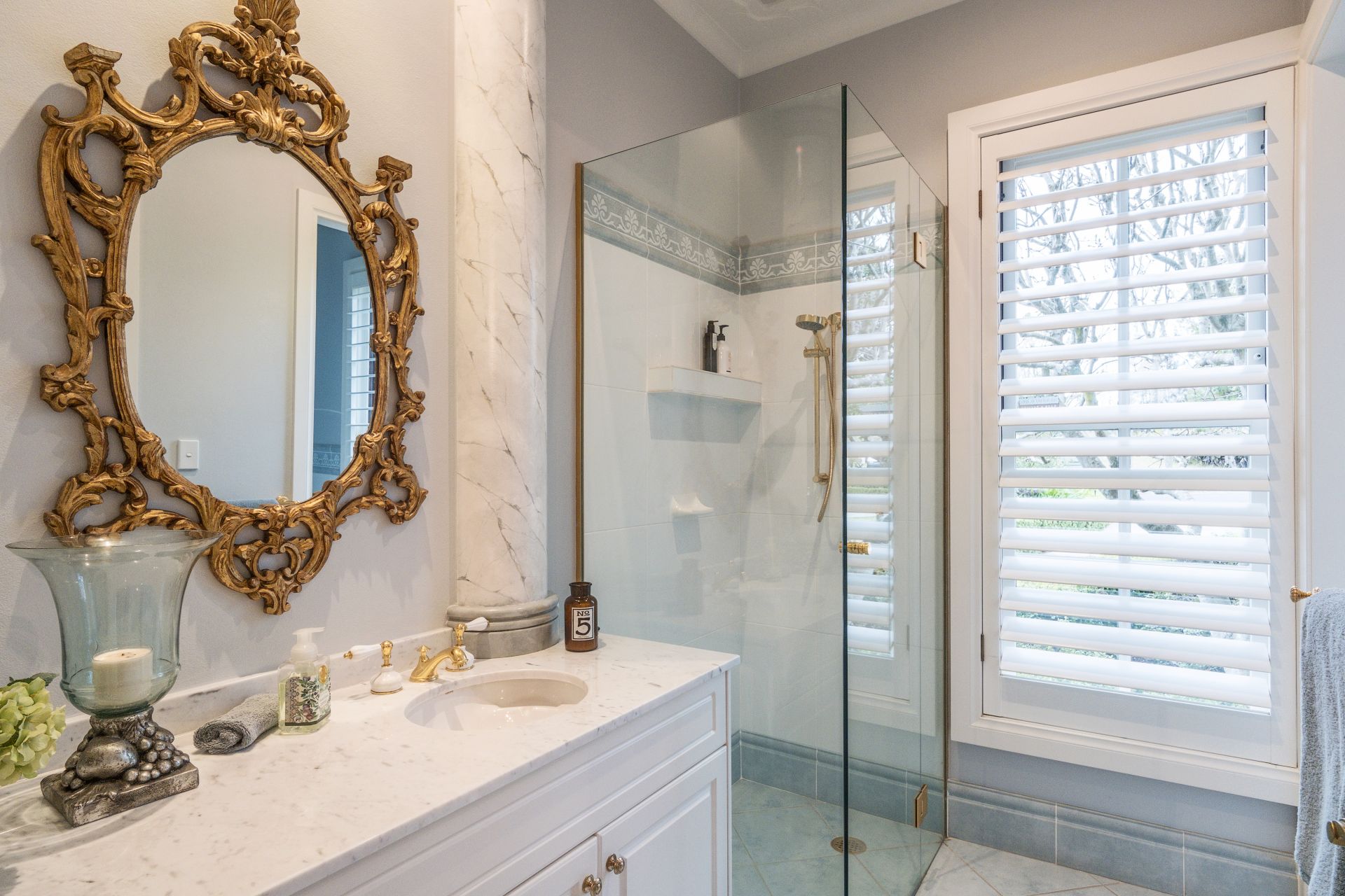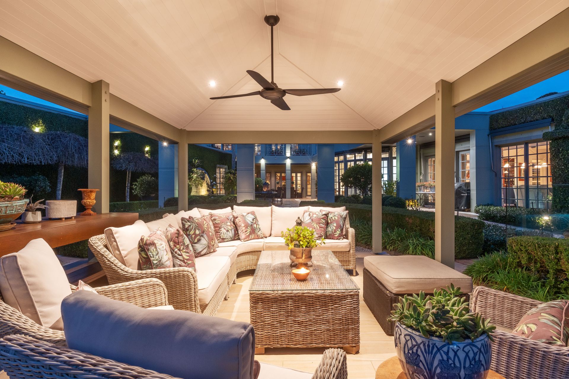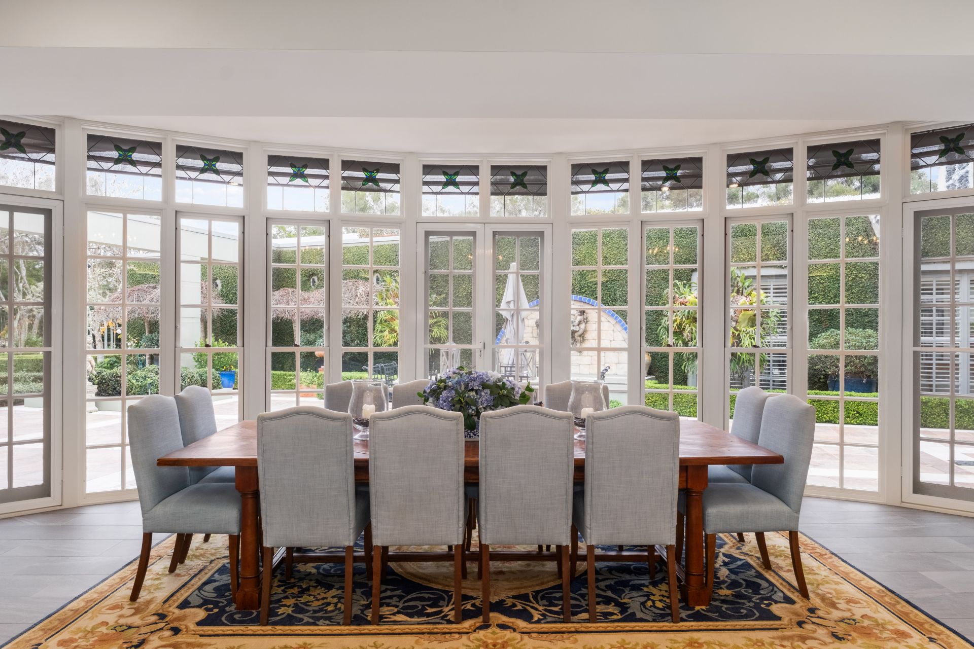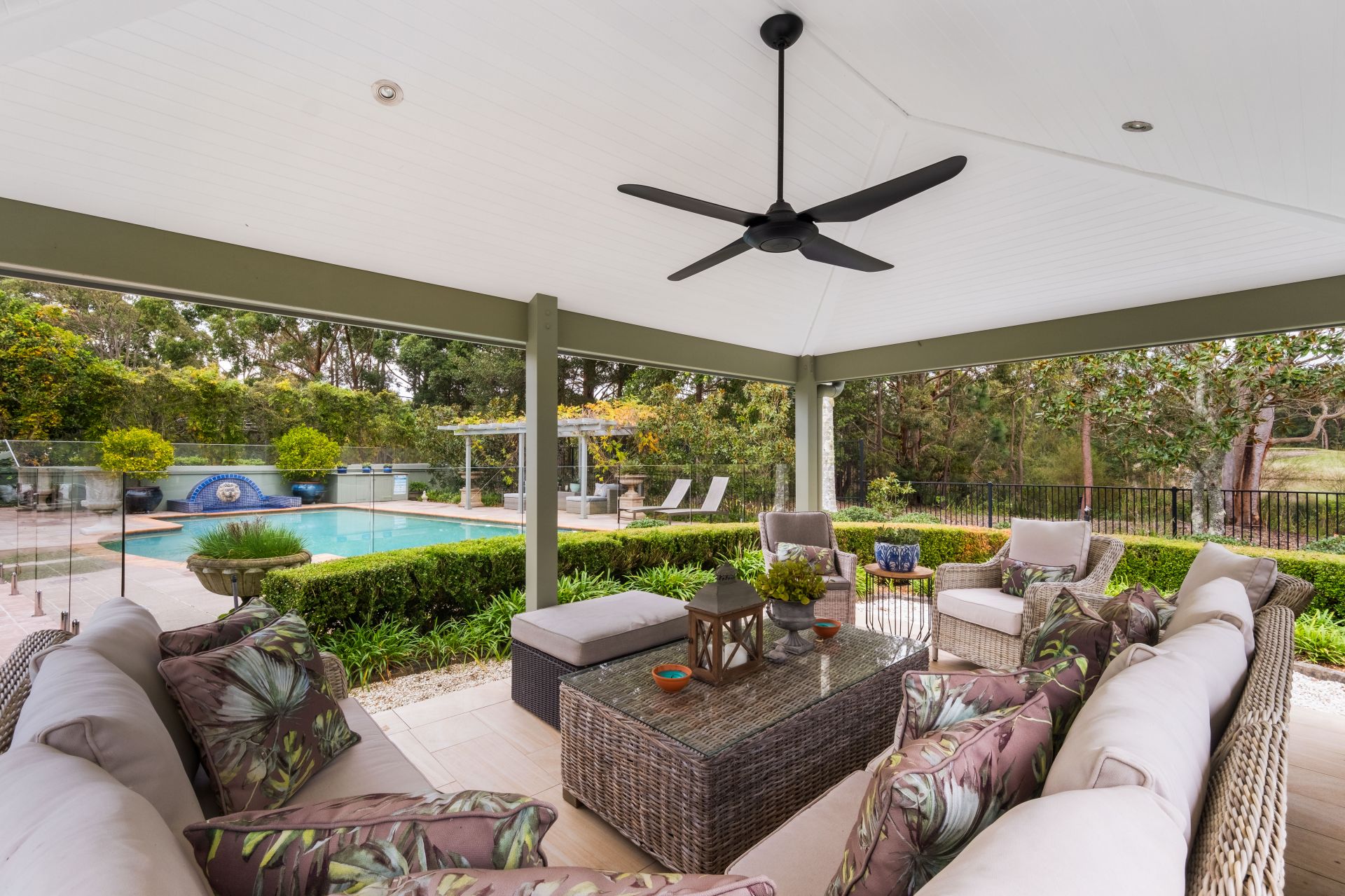 Glass sliders lead out to a magnificent, covered entertainer's terrace and a sun drenched pool