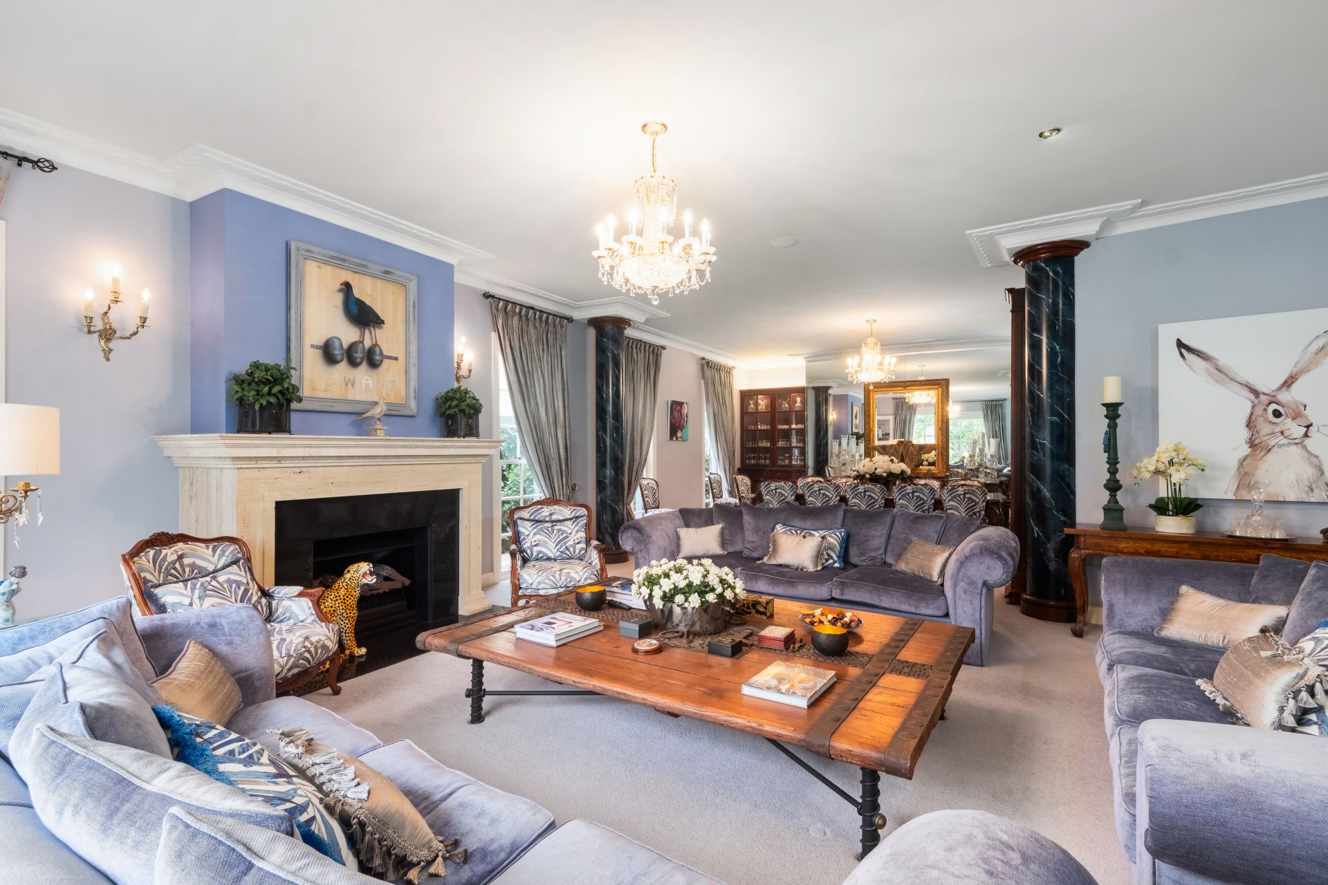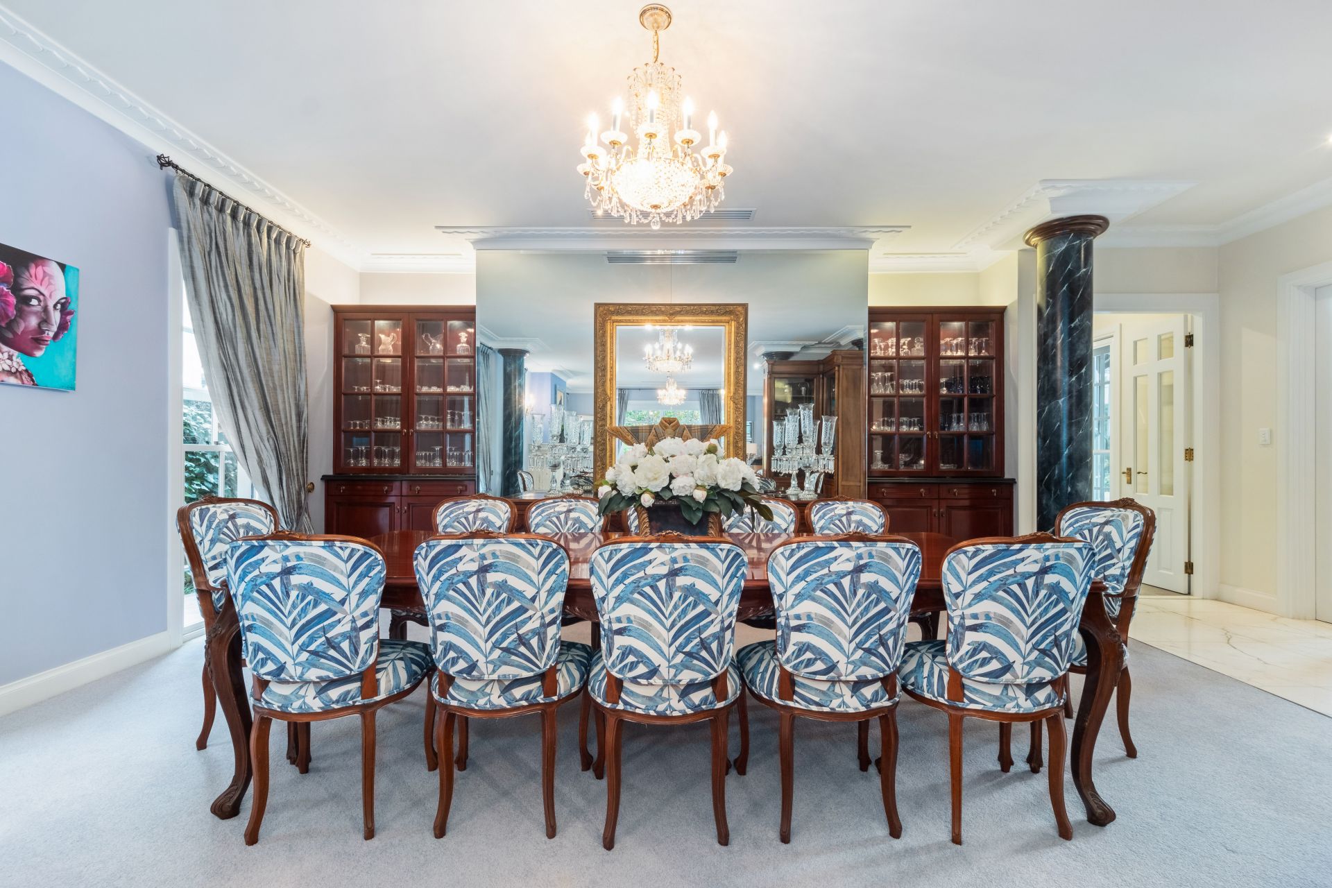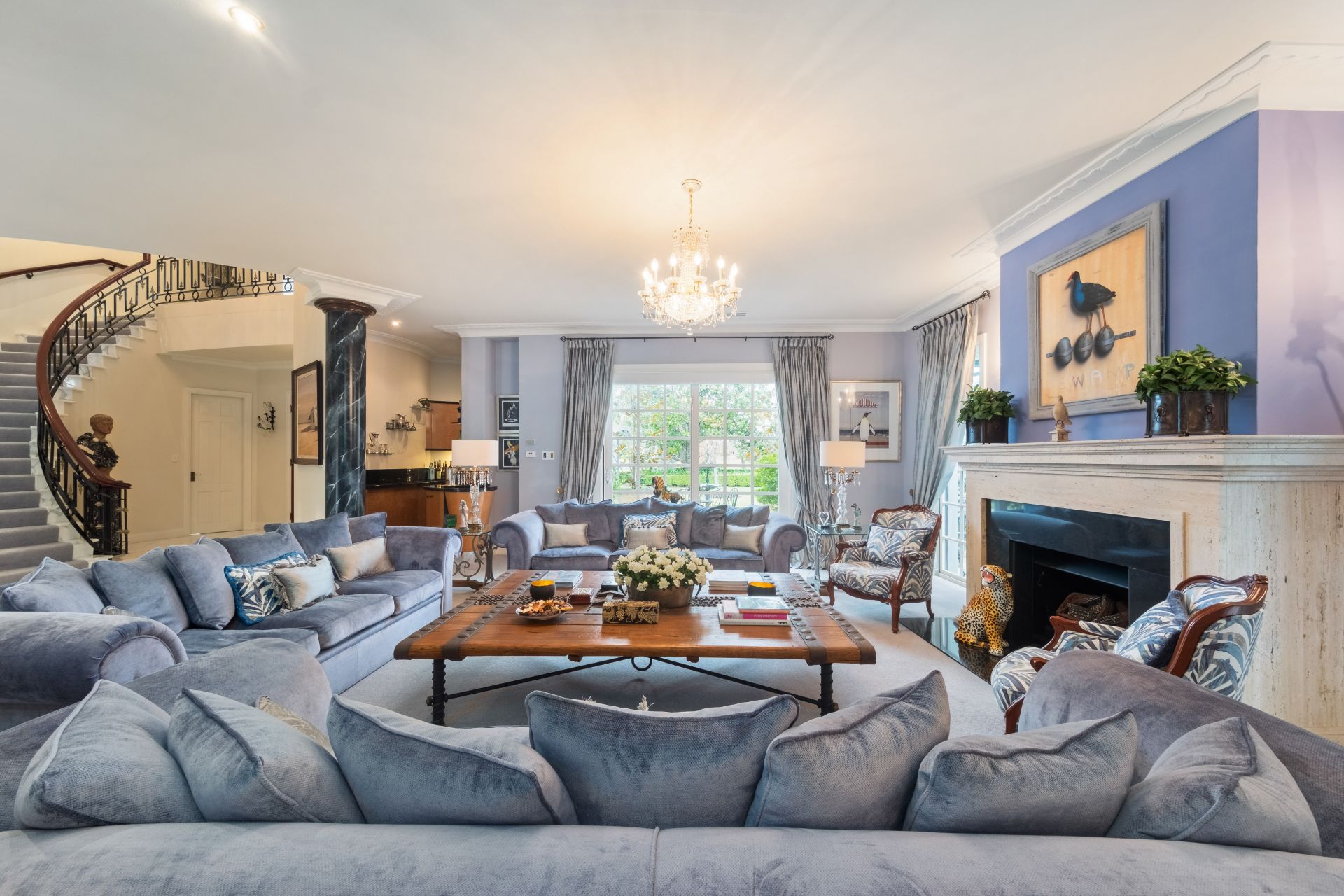 Beautiful and spacious formal living room complemented by a wet bar and fireplace with formal dining room comfortably seating twelve guests