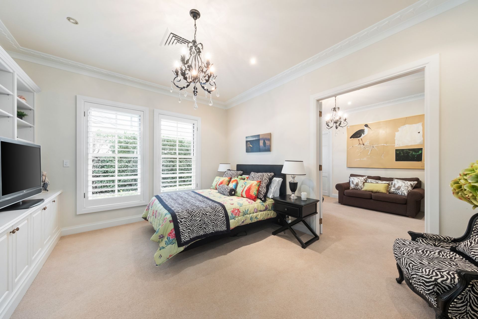 The palatial master suite includes a walk-in robe and a large ensuite opening onto a balcony overlooking the lake and golf course