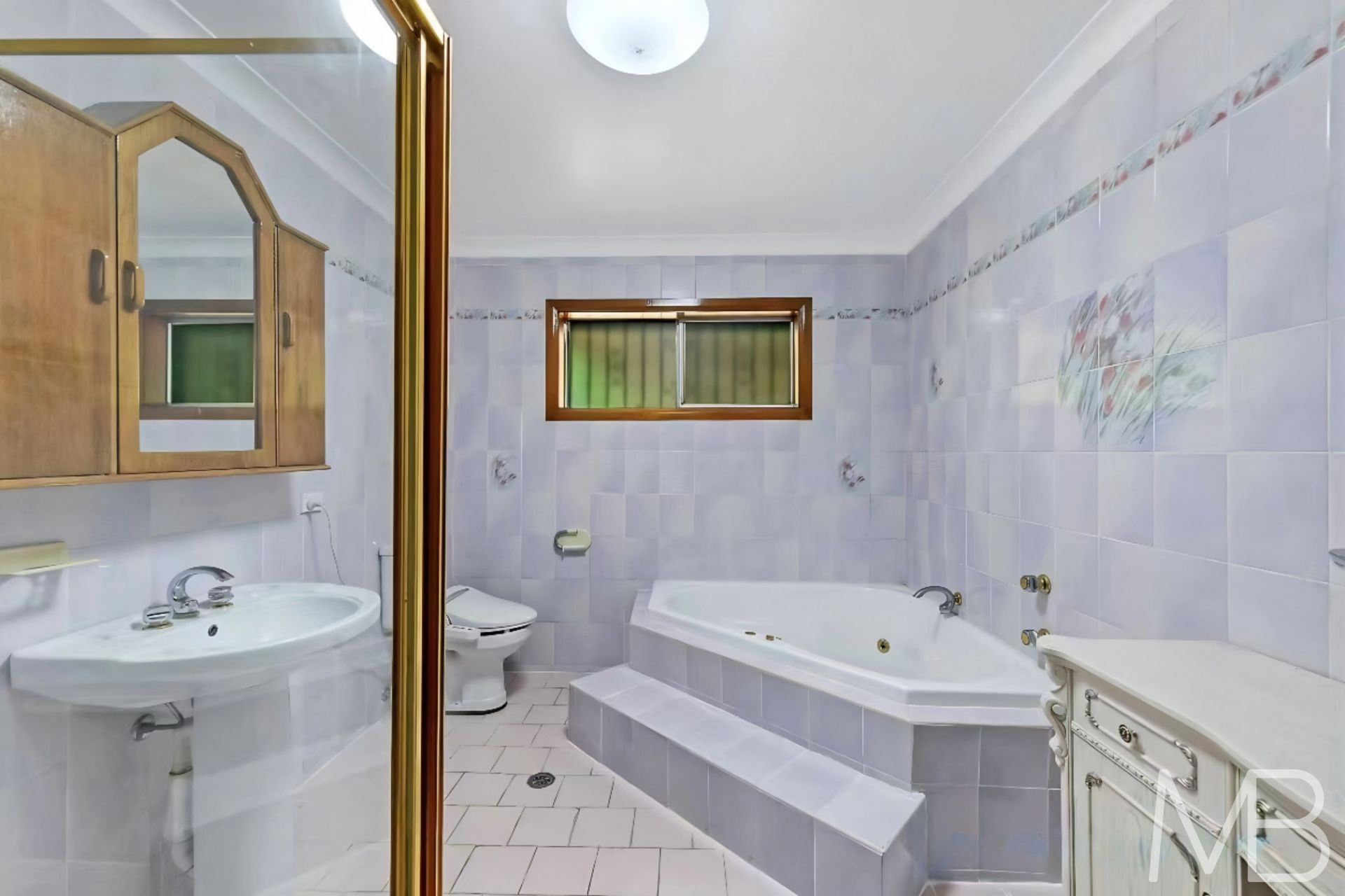 Bright bathroom with spa bath, separate shower, and practical storage