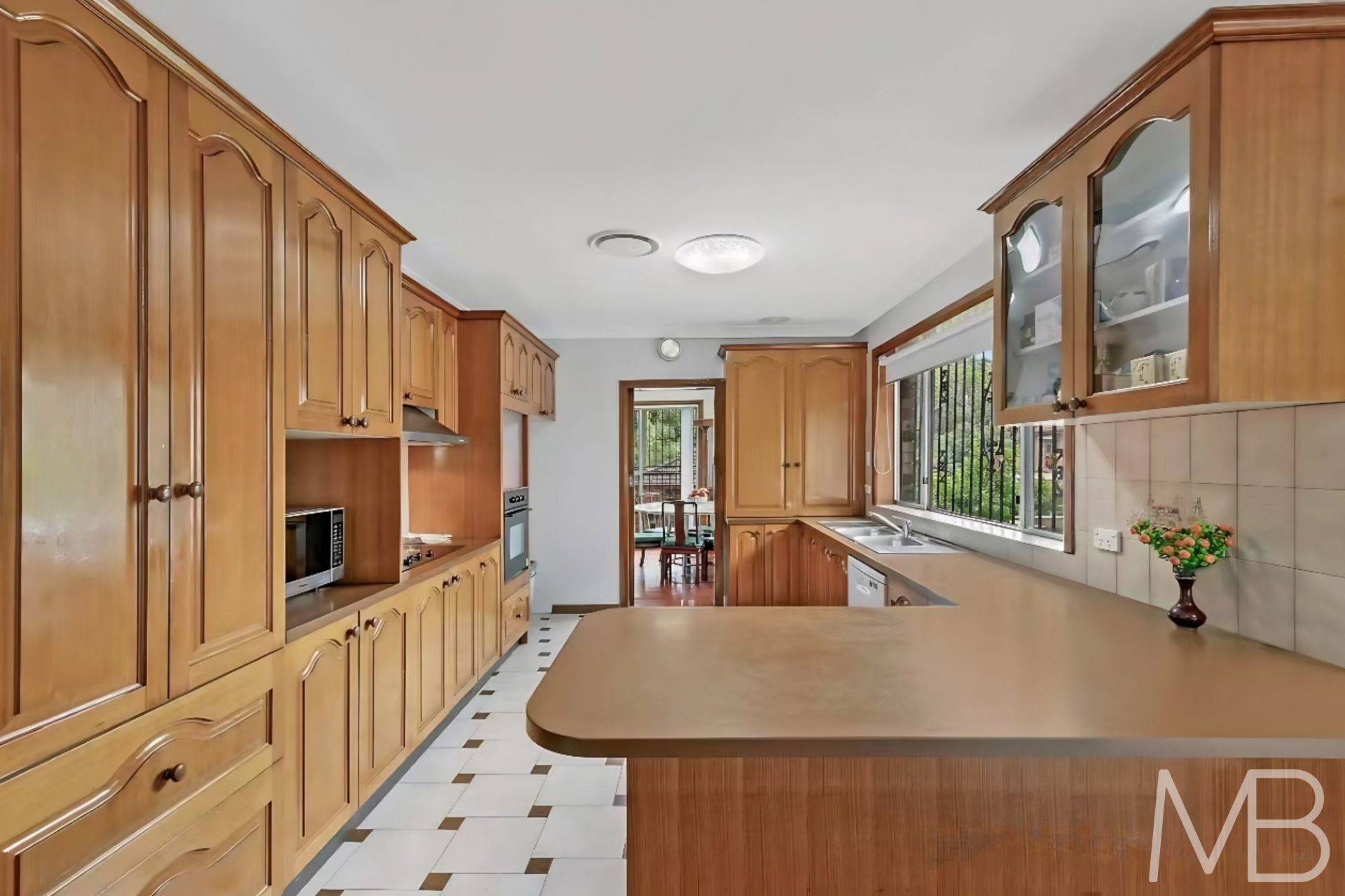 Spacious timber kitchen with ample storage, quality appliances, and a breakfast bar overlooking the leafy backyard