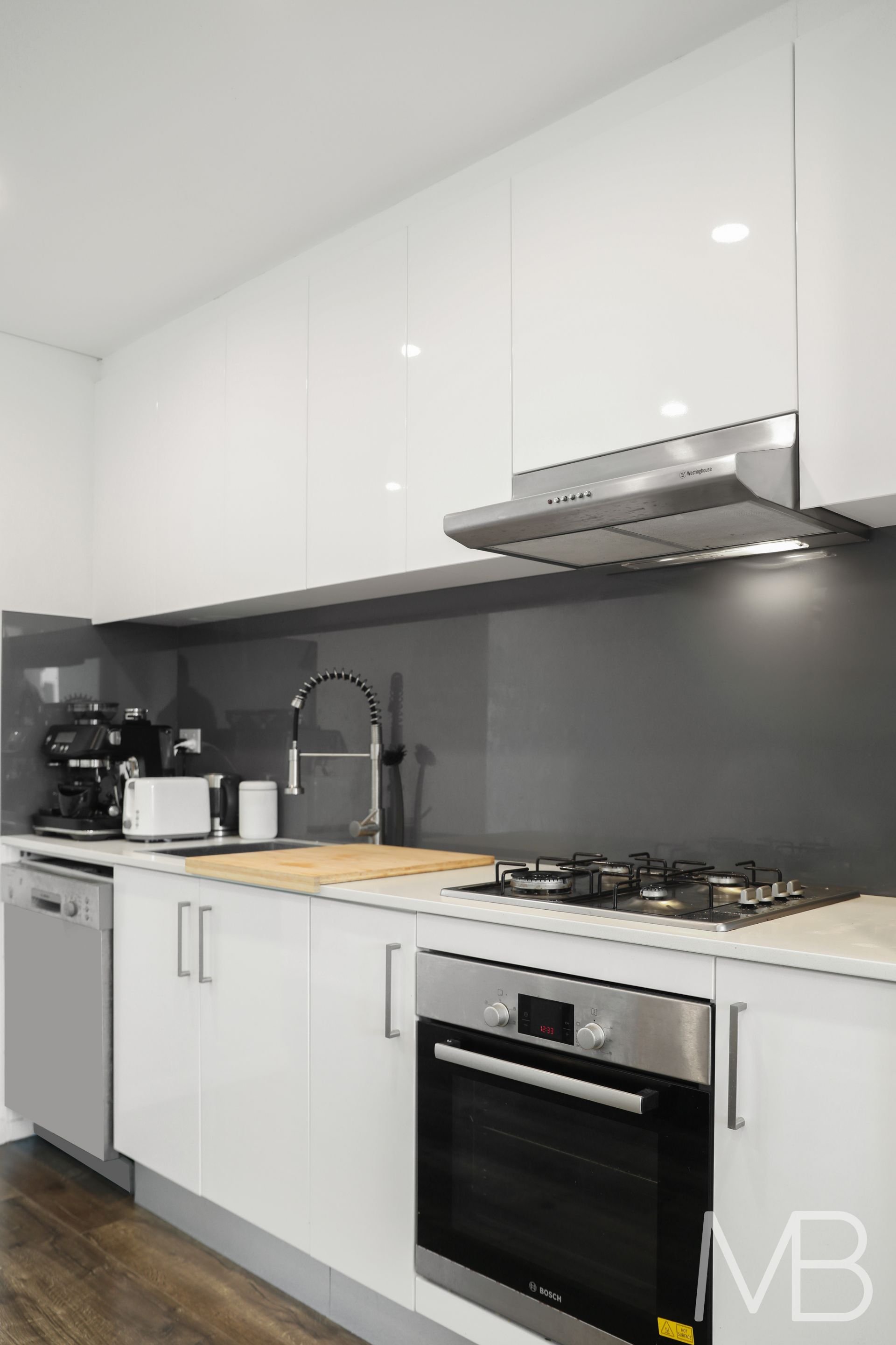 Deluxe kitchen with stone bench, gas cooktop, and glass door access to the balcony