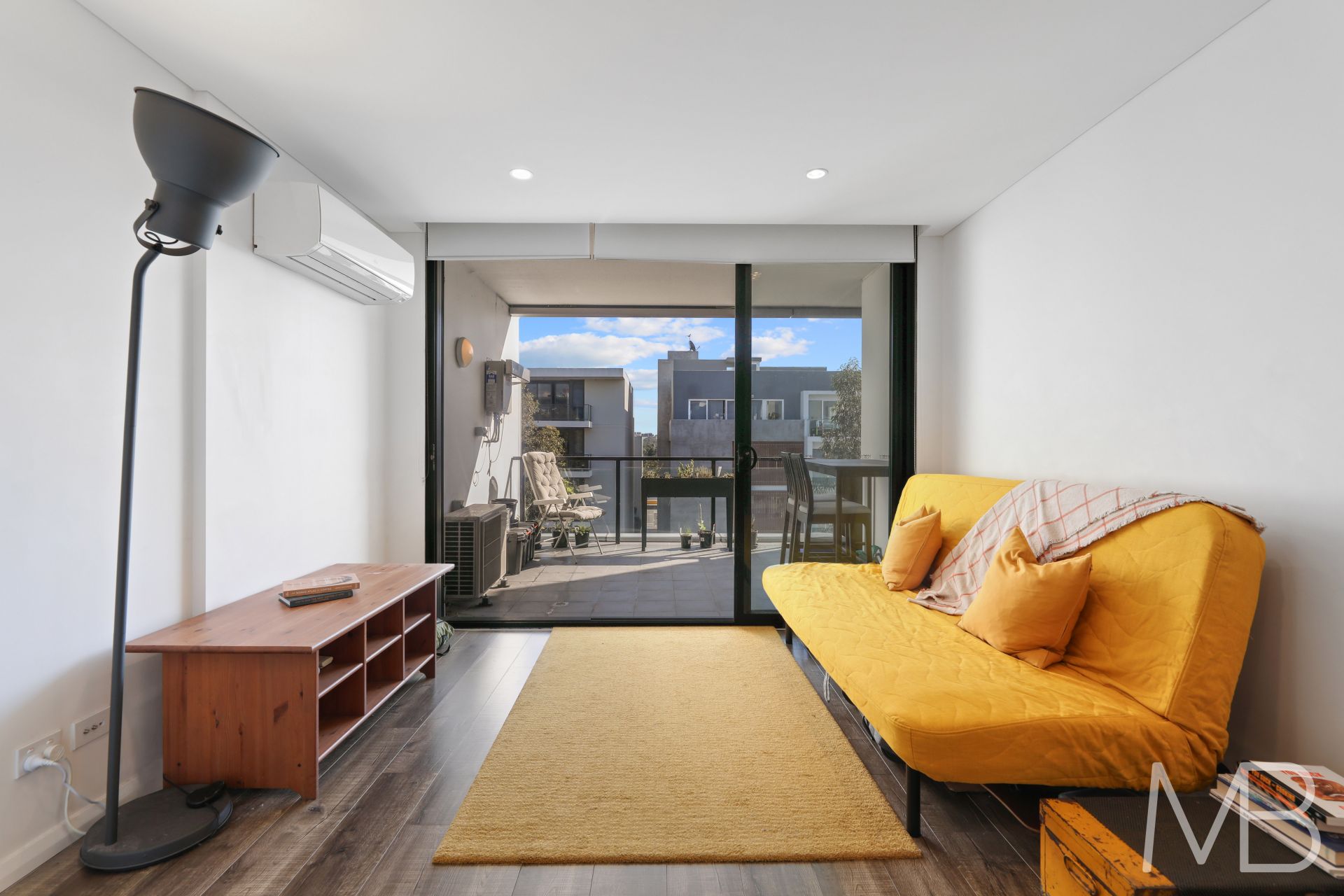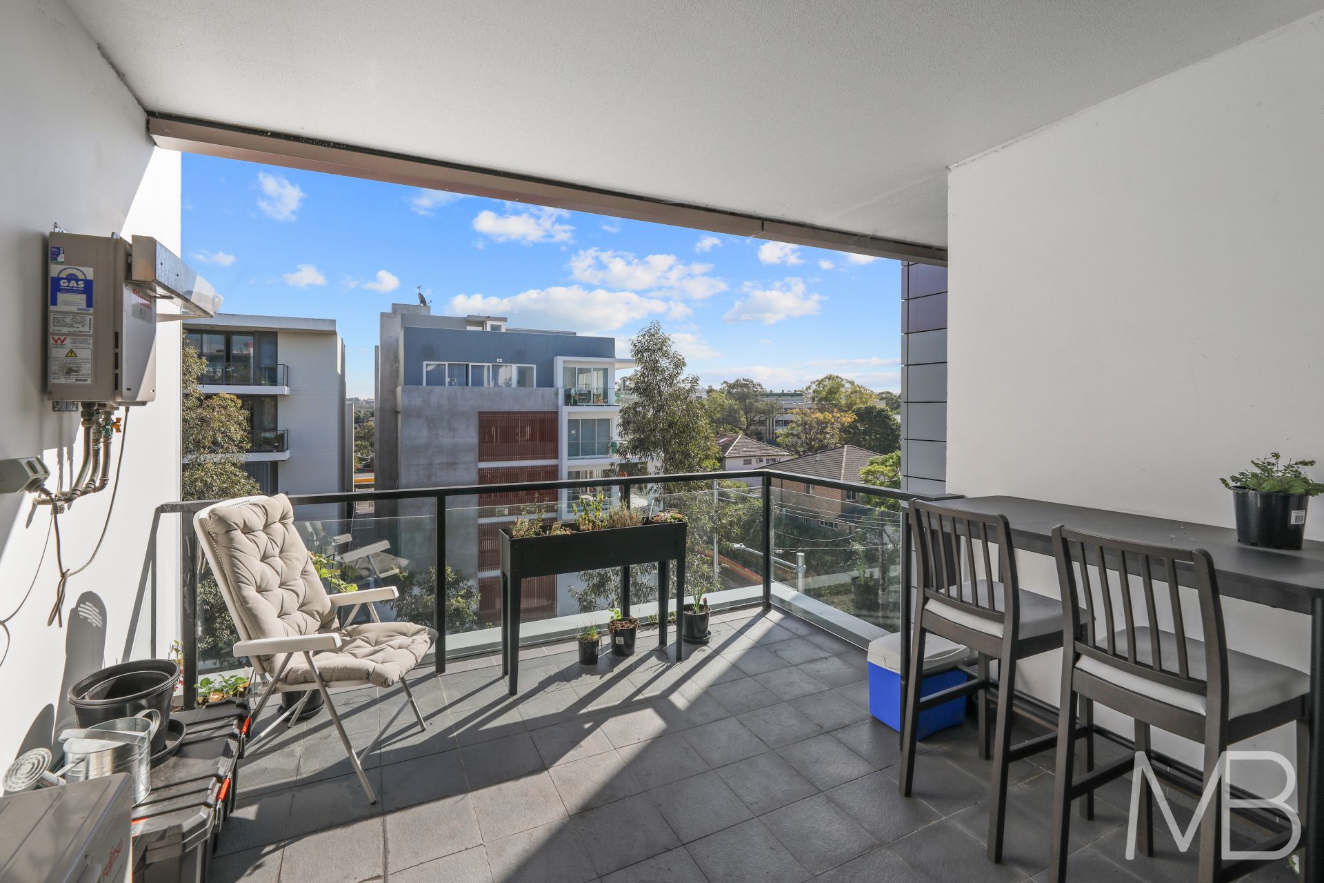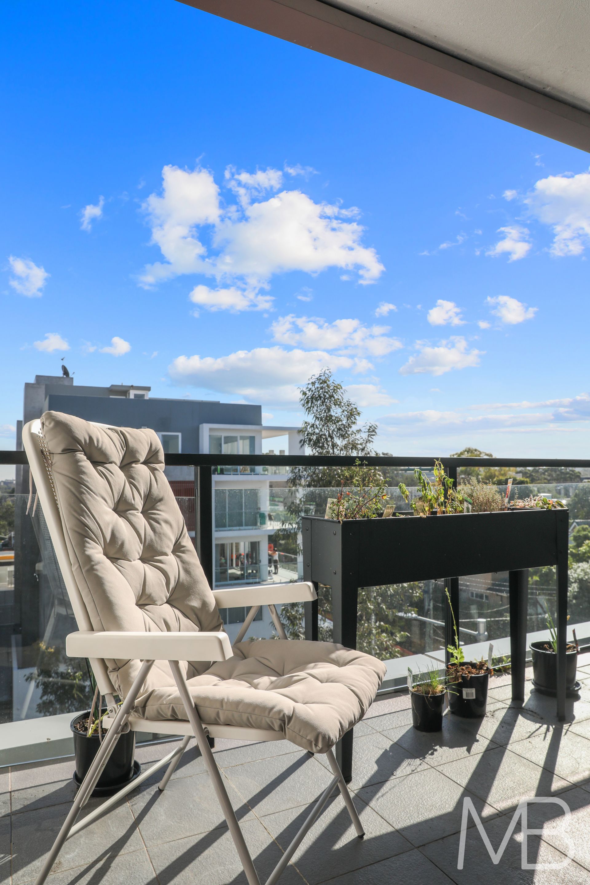 West-facing balcony basking in mid-day and afternoon sun, offering beautiful indoor-outdoor living