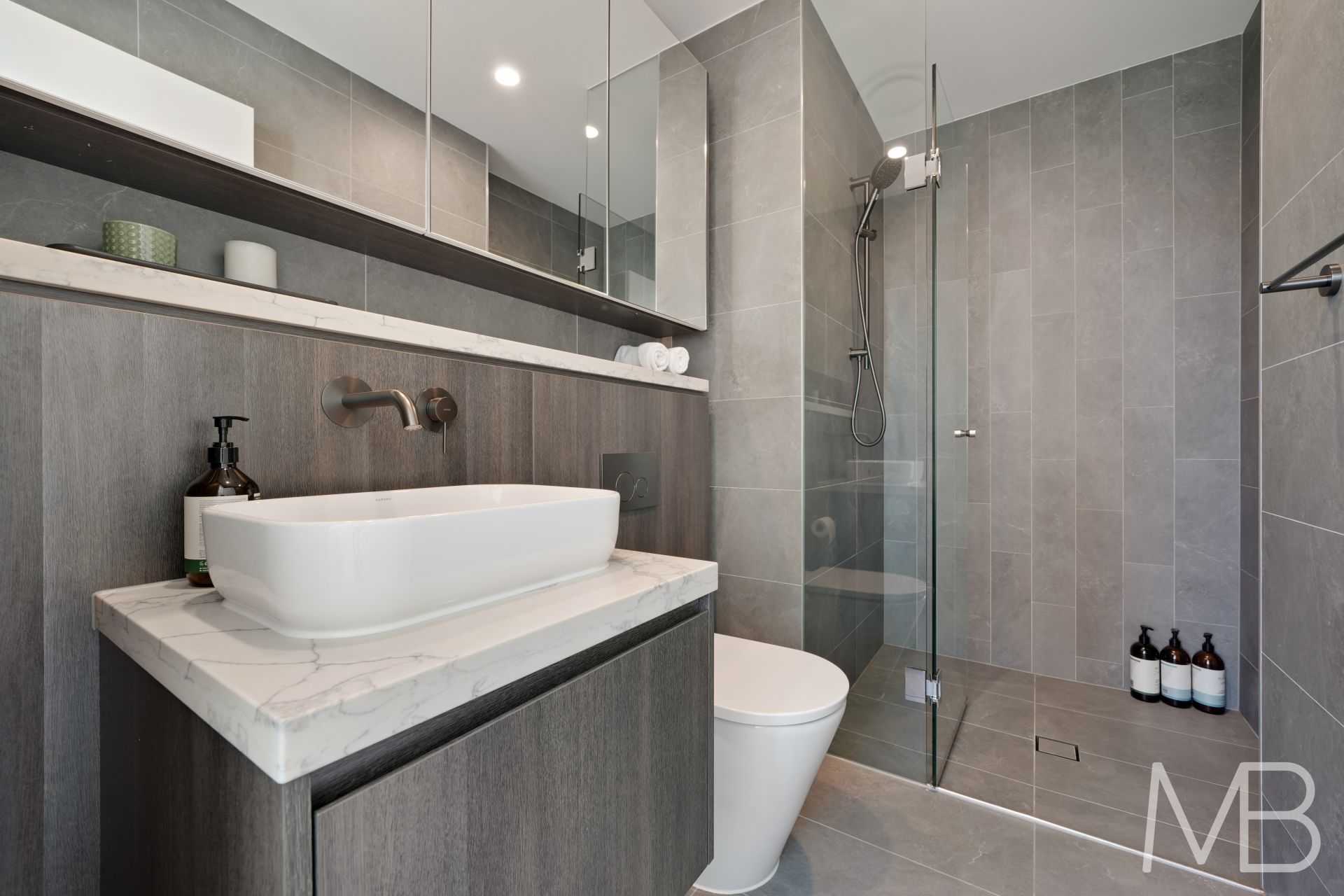 Modern bathrooms designed with wall tiles and timber accents, frameless glass shower and concealed cisterns