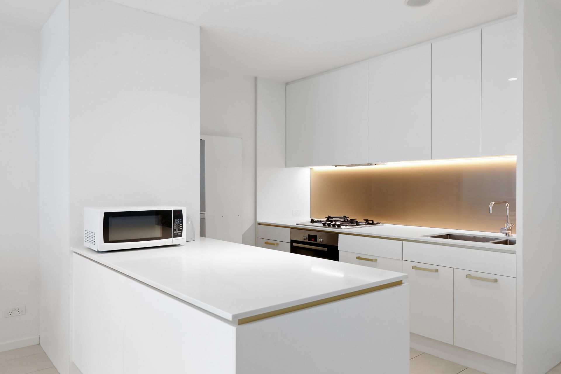 Ultra-sleek kitchen with stone benchtops, dishwasher and gas cooking